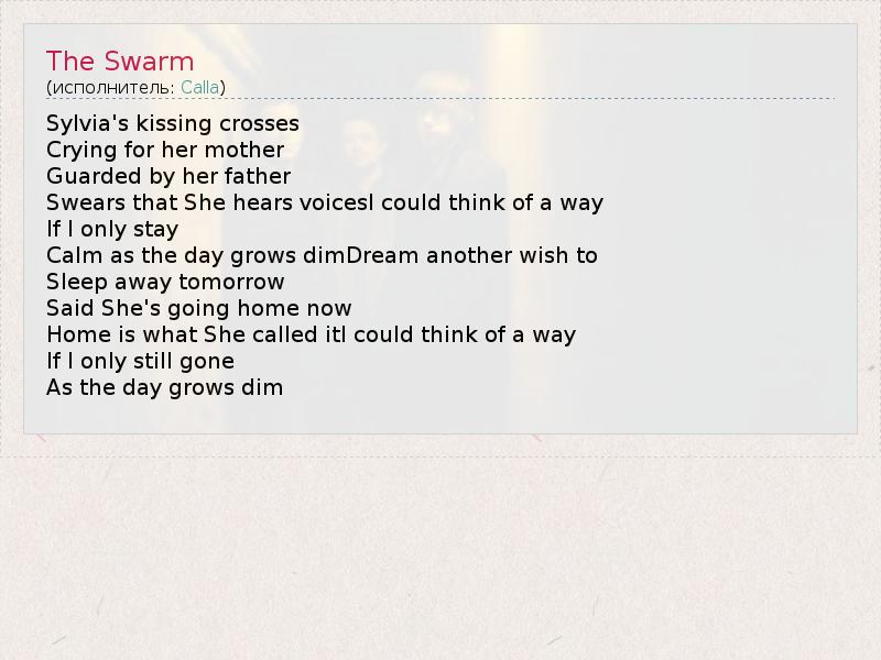 Sylvia's kissing crosses Crying for her mother Guarded by her father Swears that She hears voicesI could think of a way If I only stay Calm as the day grows dimDream another wish to Sleep away tomorrow Said She's going home now Home is what She called itI could think of a way If I only still gone As the day grows dim