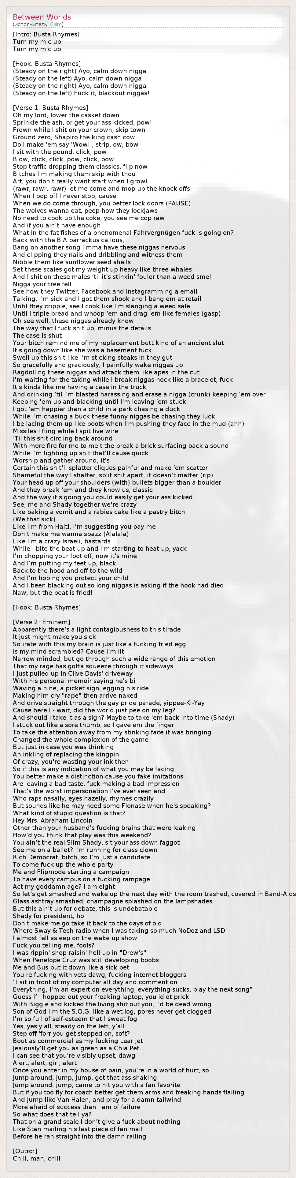 [Intro: Busta Rhymes] Turn my mic up Turn my mic up [Hook: Busta Rhymes] (Steady on the right) Ayo, calm down nigga (Steady on the left) Ayo, calm down nigga (Steady on the right) Ayo, calm down nigga (Steady on the left) Fuck it, blackout niggas! [Verse 1: Busta Rhymes] Oh my lord, lower the casket down Sprinkle the ash, or get your ass kicked, pow! Frown while I shit on your crown, skip town Ground zero, Shapiro the king cash cow Do I make 'em say 'Wow!', strip, ow, bow I sit with the pound, click, pow Blow, click, click, pow, click, pow Stop traffic dropping them classics, flip now Bitches I'm making them skip with thou Art, you don't really want start when I growl (rawr, rawr, rawr) let me come and mop up the knock offs When I pop off I never stop, cause When we do come through, you better lock doors (PAUSE) The wolves wanna eat, peep how they lockjaws No need to cook up the coke, you see me cop raw And if you ain't have enough What in the fat fishes of a phenomenal Fahrvergnügen fuck is going on? Back with the B.A barrackus callous, Bang on another song I'mma have these niggas nervous And clipping they nails and dribbling and witness them Nibble them like sunflower seed shells Set these scales got my weight up heavy like three whales And I shit on these males ‘til it's stinkin' fouler than a weed smell Nigga your tree fell See how they Twitter, Facebook and Instagramming a email Talking, I'm sick and I got them shook and I bang em at retail Until they cripple, see I cook like I'm slanging a weed sale Until I triple bread and whoop ‘em and drag 'em like females (gasp) Oh see well, these niggas already know The way that I fuck shit up, minus the details The case is shut Your bitch remind me of my replacement butt kind of an ancient slut It's going down like she was a basement fuck Swell up this shit like I'm sticking steaks in they gut So gracefully and graciously, I painfully wake niggas up Ragdolling these niggas and attack them like apes in the cut I'm waiting for the taking while I break niggas neck like a bracelet, fuck It's kinda like me having a case in the truck And drinking ‘til I'm blasted harassing and erase a nigga (crunk) keeping 'em over Keeping 'em up and blacking until I'm leaving ‘em stuck I got ‘em happier than a child in a park chasing a duck While I'm chasing a buck these funny niggas be chasing they luck I be lacing them up like boots when I'm pushing they face in the mud (ahh) Missiles I fling while I spit live wire ‘Til this shit circling back around With more fire for me to melt the break a brick surfacing back a sound While I'm lighting up shit that'll cause quick Worship and gather around, it's Certain this shit'll splatter cliques painful and make ‘em scatter Shameful the way I shatter, split shit apart, it doesn't matter (rip) Your head up off your shoulders (with) bullets bigger than a boulder And they break ‘em and they know us, classic And the way it's going you could easily get your ass kicked See, me and Shady together we're crazy Like baking a vomit and a rabies cake like a pastry bitch (We that sick) Like I'm from Haiti, I'm suggesting you pay me Don't make me wanna spazz (Alalala) Like I'm a crazy Israeli, bastards While I bite the beat up and I'm starting to heat up, yack I'm chopping your foot off, now it's mine And I'm putting my feet up, black Back to the hood and off to the wild And I'm hoping you protect your child And I been blacking out so long niggas is asking if the hook had died Naw, but the beat is fried! [Hook: Busta Rhymes] [Verse 2: Eminem] Apparently there's a light contagiousness to this tirade It just might make you sick So irate with this my brain is just like a fucking fried egg Is my mind scrambled? Cause I'm lit Narrow minded, but go through such a wide range of this emotion That my rage has gotta squeeze through it sideways I just pulled up in Clive Davis' driveway With his personal memoir saying he's bi Waving a nine, a picket sign, egging his ride Making him cry "rape" then arrive naked And drive straight through the gay pride parade, yippee-Ki-Yay Cause here I - wait, did the world just pee on my leg? And should I take it as a sign? Maybe to take 'em back into time (Shady) I stuck out like a sore thumb, so I gave em the finger To take the attention away from my stinking face it was bringing Changed the whole complexion of the game But just in case you was thinking An inkling of replacing the kingpin Of crazy, you're wasting your ink then So if this is any indication of what you may be facing You better make a distinction cause you fake imitations Are leaving a bad taste, fuck making a bad impression That's the worst impersonation I've ever seen and Who raps nasally, eyes hazelly, rhymes crazily But sounds like he may need some Flonase when he's speaking? What kind of stupid question is that? Hey Mrs. Abraham Lincoln Other than your husband's fucking brains that were leaking How'd you think that play was this weekend? You ain't the real Slim Shady, sit your ass down faggot See me on a ballot? I'm running for class clown Rich Democrat, bitch, so I'm just a candidate To come fuck up the whole party Me and Flipmode starting a campaign To have every campus on a fucking rampage Act my goddamn age? I am eight So let's get smashed and wake up the next day with the room trashed, covered in Band-Aids Glass ashtray smashed, champagne splashed on the lampshades But this ain't up for debate, this is undebatable Shady for president, ho Don't make me go take it back to the days of old Where Sway & Tech radio when I was taking so much NoDoz and LSD I almost fell asleep on the wake up show Fuck you telling me, fools? I was rippin' shop raisin' hell up in "Drew's" When Penelope Cruz was still developing boobs Me and Bus put it down like a sick pet You're fucking with vets dawg, fucking internet bloggers "I sit in front of my computer all day and comment on Everything, I'm an expert on everything, everything sucks, play the n
