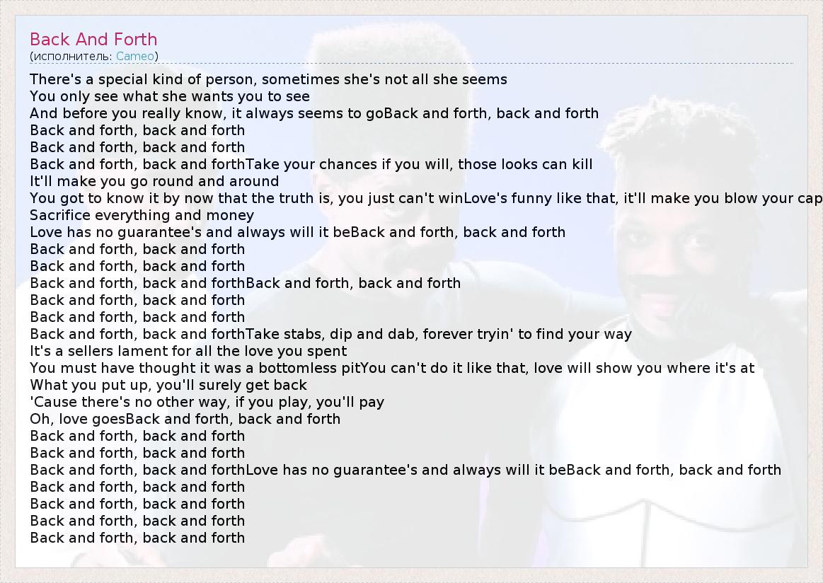Back and forth, back and forthLove has no guarantee's and always will it beBack and forth, back and forth
