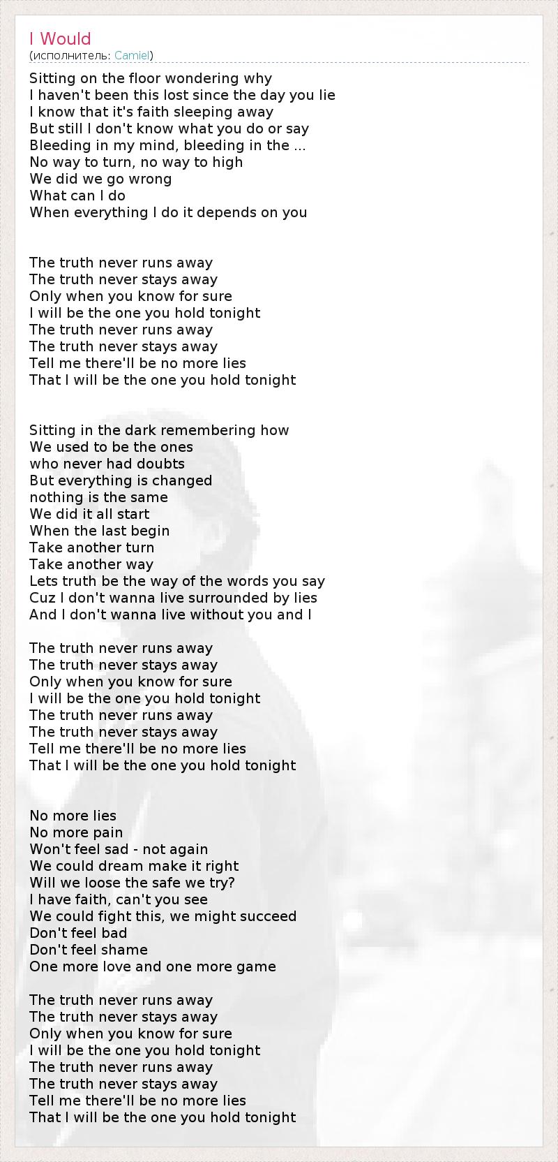 Sitting on the floor wondering why I haven't been this lost since the day you lie I know that it's faith sleeping away But still I don't know what you do or say Bleeding in my mind, bleeding in the ... No way to turn, no way to high We did we go wrong What can I do When everything I do it depends on you The truth never runs away The truth never stays away Only when you know for sure I will be the one you hold tonight The truth never runs away The truth never stays away Tell me there'll be no more lies That I will be the one you hold tonight Sitting in the dark remembering how We used to be the ones who never had doubts But everything is changed nothing is the same We did it all start When the last begin Take another turn Take another way Lets truth be the way of the words you say Cuz I don't wanna live surrounded by lies And I don't wanna live without you and I The truth never runs away The truth never stays away Only when you know for sure I will be the one you hold tonight The truth never runs away The truth never stays away Tell me there'll be no more lies That I will be the one you hold tonight No more lies No more pain Won't feel sad - not again We could dream make it right Will we loose the safe we try? I have faith, can't you see We could fight this, we might succeed Don't feel bad Don't feel shame One more love and one more game The truth never runs away The truth never stays away Only when you know for sure I will be the one you hold tonight The truth never runs away The truth never stays away Tell me there'll be no more lies That I will be the one you hold tonight