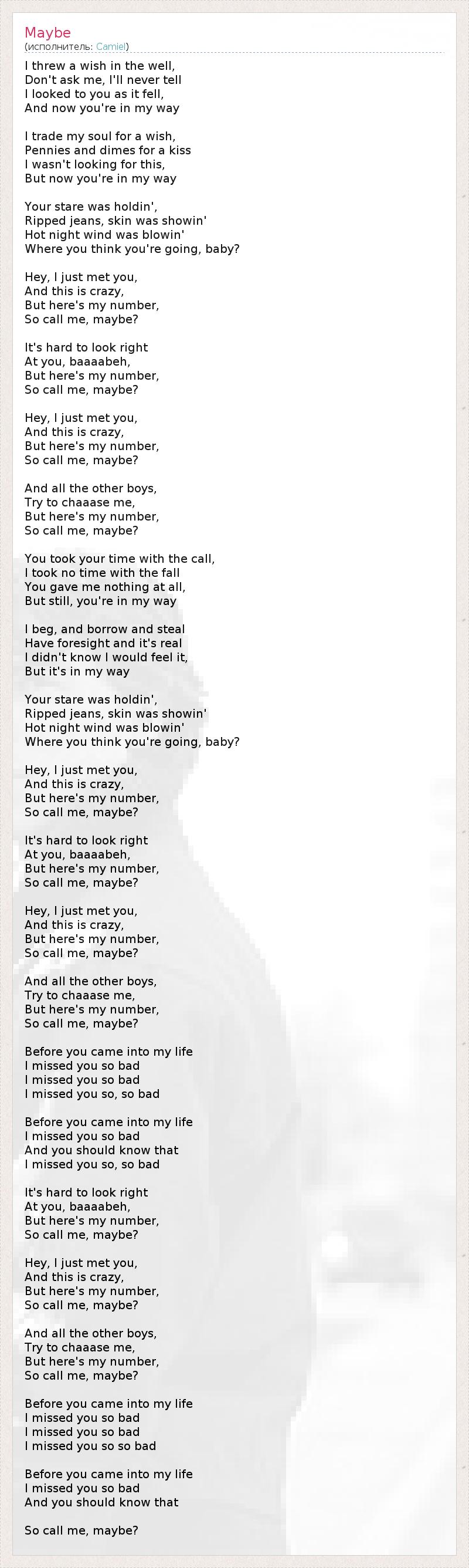 I threw a wish in the well, Don't ask me, I'll never tell I looked to you as it fell, And now you're in my way I trade my soul for a wish, Pennies and dimes for a kiss I wasn't looking for this, But now you're in my way Your stare was holdin', Ripped jeans, skin was showin' Hot night wind was blowin' Where you think you're going, baby? Hey, I just met you, And this is crazy, But here's my number, So call me, maybe? It's hard to look right At you, baaaabeh, But here's my number, So call me, maybe? Hey, I just met you, And this is crazy, But here's my number, So call me, maybe? And all the other boys, Try to chaaase me, But here's my number, So call me, maybe? You took your time with the call, I took no time with the fall You gave me nothing at all, But still, you're in my way I beg, and borrow and steal Have foresight and it's real I didn't know I would feel it, But it's in my way Your stare was holdin', Ripped jeans, skin was showin' Hot night wind was blowin' Where you think you're going, baby? Hey, I just met you, And this is crazy, But here's my number, So call me, maybe? It's hard to look right At you, baaaabeh, But here's my number, So call me, maybe? Hey, I just met you, And this is crazy, But here's my number, So call me, maybe? And all the other boys, Try to chaaase me, But here's my number, So call me, maybe? Before you came into my life I missed you so bad I missed you so bad I missed you so, so bad Before you came into my life I missed you so bad And you should know that I missed you so, so bad It's hard to look right At you, baaaabeh, But here's my number, So call me, maybe? Hey, I just met you, And this is crazy, But here's my number, So call me, maybe? And all the other boys, Try to chaaase me, But here's my number, So call me, maybe? Before you came into my life I missed you so bad I missed you so bad I missed you so so bad Before you came into my life I missed you so bad And you should know that So call me, maybe?