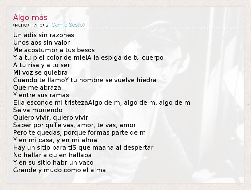 Un adis sin razones Unos aos sin valor Me acostumbr a tus besos Y a tu piel color de mielA la espiga de tu cuerpo A tu risa y a tu ser Mi voz se quiebra Cuando te llamoY tu nombre se vuelve hiedra Que me abraza Y entre sus ramas Ella esconde mi tristezaAlgo de m, algo de m, algo de m Se va muriendo Quiero vivir, quiero vivir Saber por quTe vas, amor, te vas, amor Pero te quedas, porque formas parte de m Y en mi casa, y en mi alma Hay un sitio para tiS que maana al despertar No hallar a quien hallaba Y en su sitio habr un vaco Grande y mudo como el alma