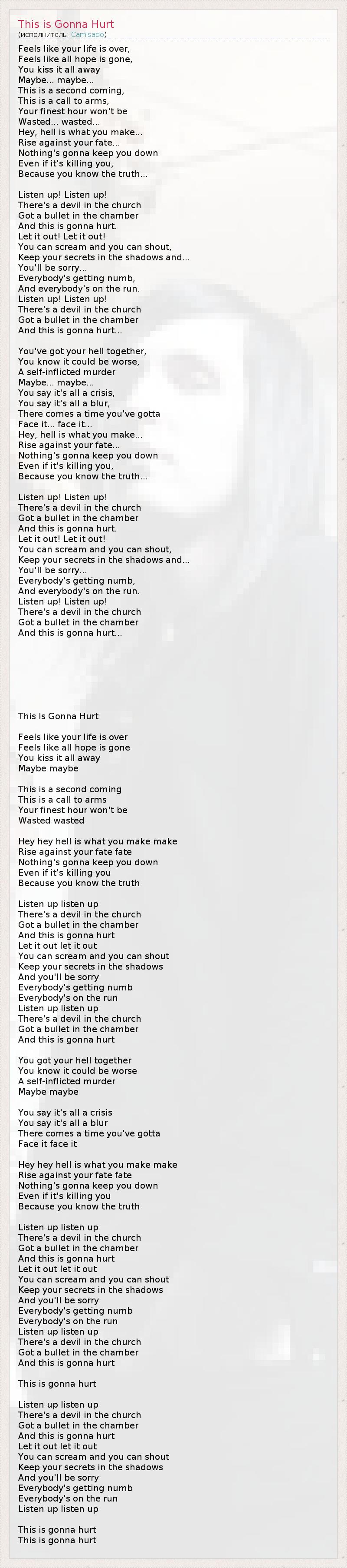 Feels like your life is over, Feels like all hope is gone, You kiss it all away Maybe... maybe... This is a second coming, This is a call to arms, Your finest hour won't be Wasted... wasted... Hey, hell is what you make... Rise against your fate... Nothing's gonna keep you down Even if it's killing you, Because you know the truth... Listen up! Listen up! There's a devil in the church Got a bullet in the chamber And this is gonna hurt. Let it out! Let it out! You can scream and you can shout, Keep your secrets in the shadows and... You'll be sorry... Everybody's getting numb, And everybody's on the run. Listen up! Listen up! There's a devil in the church Got a bullet in the chamber And this is gonna hurt... You've got your hell together, You know it could be worse, A self-inflicted murder Maybe... maybe... You say it's all a crisis, You say it's all a blur, There comes a time you've gotta Face it... face it... Hey, hell is what you make... Rise against your fate... Nothing's gonna keep you down Even if it's killing you, Because you know the truth... Listen up! Listen up! There's a devil in the church Got a bullet in the chamber And this is gonna hurt. Let it out! Let it out! You can scream and you can shout, Keep your secrets in the shadows and... You'll be sorry... Everybody's getting numb, And everybody's on the run. Listen up! Listen up! There's a devil in the church Got a bullet in the chamber And this is gonna hurt... This Is Gonna Hurt Feels like your life is over Feels like all hope is gone You kiss it all away Maybe maybe This is a second coming This is a call to arms Your finest hour won't be Wasted wasted Hey hey hell is what you make make Rise against your fate fate Nothing's gonna keep you down Even if it's killing you Because you know the truth Listen up listen up There's a devil in the church Got a bullet in the chamber And this is gonna hurt Let it out let it out You can scream and you can shout Keep your secrets in the shadows And you'll be sorry Everybody's getting numb Everybody's on the run Listen up listen up There's a devil in the church Got a bullet in the chamber And this is gonna hurt You got your hell together You know it could be worse A self-inflicted murder Maybe maybe You say it's all a crisis You say it's all a blur There comes a time you've gotta Face it face it Hey hey hell is what you make make Rise against your fate fate Nothing's gonna keep you down Even if it's killing you Because you know the truth Listen up listen up There's a devil in the church Got a bullet in the chamber And this is gonna hurt Let it out let it out You can scream and you can shout Keep your secrets in the shadows And you'll be sorry Everybody's getting numb Everybody's on the run Listen up listen up There's a devil in the church Got a bullet in the chamber And this is gonna hurt This is gonna hurt Listen up listen up There's a devil in the church Got a bullet in the chamber And this is gonna hurt Let it out let it out You can scream and you can shout Keep your secrets in the shadows And you'll be sorry Everybody's getting numb Everybody's on the run Listen up listen up This is gonna hurt This is gonna hurt