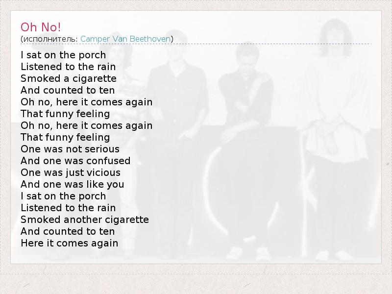 I sat on the porch Listened to the rain Smoked a cigarette And counted to ten Oh no, here it comes again That funny feeling Oh no, here it comes again That funny feeling One was not serious And one was confused One was just vicious And one was like you I sat on the porch Listened to the rain Smoked another cigarette And counted to ten Here it comes again