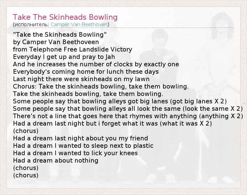 "Take the Skinheads Bowling" by Camper Van Beethoveen from Telephone Free Landslide Victory Everyday I get up and pray to Jah And he increases the number of clocks by exactly one Everybody's coming home for lunch these days Last night there were skinheads on my lawn Chorus: Take the skinheads bowling, take them bowling. Take the skinheads bowling, take them bowling. Some people say that bowling alleys got big lanes (got big lanes X 2) Some people say that bowling alleys all look the same (look the same X 2) There's not a line that goes here that rhymes with anything (anything X 2) Had a dream last night but i forget what it was (what it was X 2) (chorus) Had a dream last night about you my friend Had a dream I wanted to sleep next to plastic Had a dream I wanted to lick your knees Had a dream about nothing (chorus) (chorus)