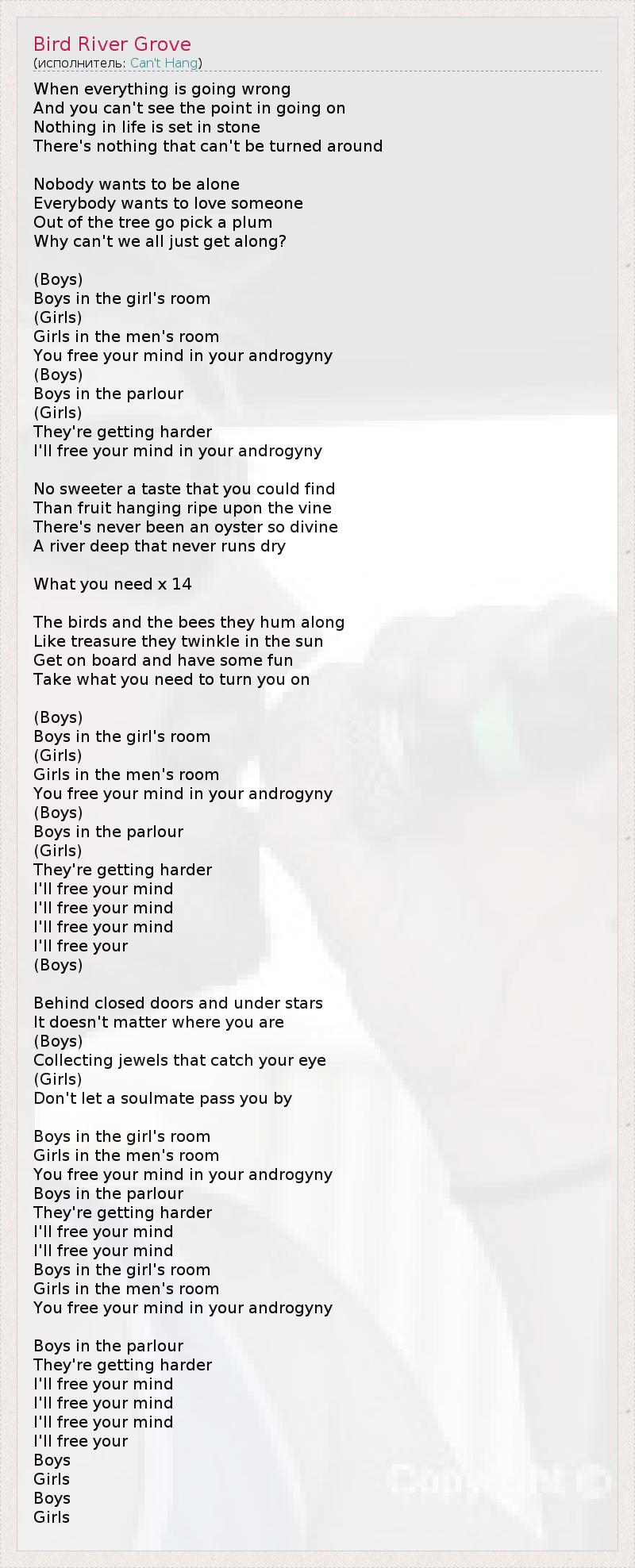 When everything is going wrong And you can't see the point in going on Nothing in life is set in stone There's nothing that can't be turned around Nobody wants to be alone Everybody wants to love someone Out of the tree go pick a plum Why can't we all just get along? (Boys) Boys in the girl's room (Girls) Girls in the men's room You free your mind in your androgyny (Boys) Boys in the parlour (Girls) They're getting harder I'll free your mind in your androgyny No sweeter a taste that you could find Than fruit hanging ripe upon the vine There's never been an oyster so divine A river deep that never runs dry What you need x 14 The birds and the bees they hum along Like treasure they twinkle in the sun Get on board and have some fun Take what you need to turn you on (Boys) Boys in the girl's room (Girls) Girls in the men's room You free your mind in your androgyny (Boys) Boys in the parlour (Girls) They're getting harder I'll free your mind I'll free your mind I'll free your mind I'll free your (Boys) Behind closed doors and under stars It doesn't matter where you are (Boys) Collecting jewels that catch your eye (Girls) Don't let a soulmate pass you by Boys in the girl's room Girls in the men's room You free your mind in your androgyny Boys in the parlour They're getting harder I'll free your mind I'll free your mind Boys in the girl's room Girls in the men's room You free your mind in your androgyny Boys in the parlour They're getting harder I'll free your mind I'll free your mind I'll free your mind I'll free your Boys Girls Boys Girls