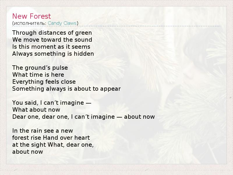 Through distances of green We move toward the sound Is this moment as it seems Always something is hidden The ground’s pulse What time is here Everything feels close Something always is about to appear You said, I can’t imagine — What about now Dear one, dear one, I can’t imagine — about now In the rain see a new forest rise Hand over heart at the sight What, dear one, about now