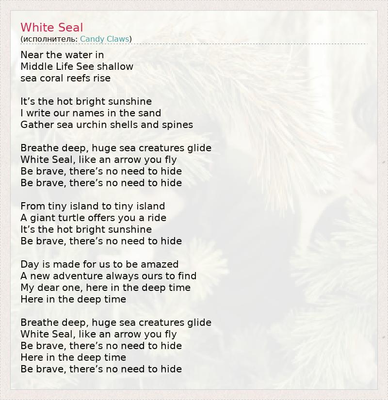 Near the water in Middle Life See shallow sea coral reefs rise It’s the hot bright sunshine I write our names in the sand Gather sea urchin shells and spines Breathe deep, huge sea creatures glide White Seal, like an arrow you fly Be brave, there’s no need to hide Be brave, there’s no need to hide From tiny island to tiny island A giant turtle offers you a ride It’s the hot bright sunshine Be brave, there’s no need to hide Day is made for us to be amazed A new adventure always ours to find My dear one, here in the deep time Here in the deep time Breathe deep, huge sea creatures glide White Seal, like an arrow you fly Be brave, there’s no need to hide Here in the deep time Be brave, there’s no need to hide