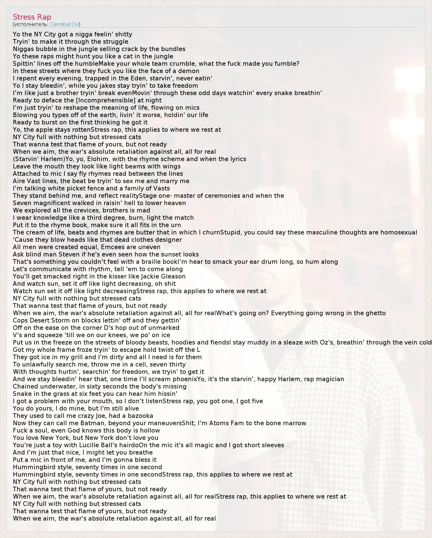 Yo the NY City got a nigga feelin' shitty Tryin' to make it through the struggle Niggas bubble in the jungle selling crack by the bundles Yo these raps might hunt you like a cat in the jungle Spittin' lines off the humbleMake your whole team crumble, what the fuck made you fumble? In these streets where they fuck you like the face of a demon I repent every evening, trapped in the Eden, starvin', never eatin' Yo I stay bleedin', while you jakes stay tryin' to take freedom I'm like just a brother tryin' break evenMovin' through these odd days watchin' every snake breathin' Ready to deface the [Incomprehensible] at night I'm just tryin' to reshape the meaning of life, flowing on mics Blowing you types off of the earth, livin' it worse, holdin' our life Ready to burst on the first thinking he got it Yo, the apple stays rottenStress rap, this applies to where we rest at NY City full with nothing but stressed cats That wanna test that flame of yours, but not ready When we aim, the war's absolute retaliation against all, all for real (Starvin' Harlem)Yo, yo, Elohim, with the rhyme scheme and when the lyrics Leave the mouth they look like light beams with wings Attached to mic I say fly rhymes read between the lines Aire Vast lines, the beat be tryin' to sex me and marry me I'm talking white picket fence and a family of Vasts They stand behind me, and reflect realityStage one- master of ceremonies and when the Seven magnificent walked in raisin' hell to lower heaven We explored all the crevices, brothers is mad I wear knowledge like a third degree, burn, light the match Put it to the rhyme book, make sure it all fits in the urn The cream of life, beats and rhymes are butter that in which I churnStupid, you could say these masculine thoughts are homosexual 'Cause they blow heads like that dead clothes designer All men were created equal, Emcees are uneven Ask blind man Steven if he's even seen how the sunset looks That's something you couldn't feel with a braille bookI'm hear to smack your ear drum long, so hum along Let's communicate with rhythm, tell 'em to come along You'll get smacked right in the kisser like Jackie Gleason And watch sun, set it off like light decreasing, oh shit Watch sun set it off like light decreasingStress rap, this applies to where we rest at NY City full with nothing but stressed cats That wanna test that flame of yours, but not ready When we aim, the war's absolute retaliation against all, all for realWhat's going on? Everything going wrong in the ghetto Cops Desert Storm on blocks lettin' off and they gettin' Off on the ease on the corner D's hop out of unmarked V's and squeeze 'till we on our knees, we po' on ice Put us in the freeze on the streets of bloody beasts, hoodies and fiendsI stay muddy in a sleaze with Oz's, breathin' through the vein cold Got my whole frame froze tryin' to escape hold twist off the L They got ice in my grill and I'm dirty and all I need is for them To unlawfully search me, throw me in a cell, seven thirty With thoughts hurtin', searchin' for freedom, we tryin' to get it And we stay bleedin' hear that, one time I'll scream phoenixYo, it's the starvin', happy Harlem, rap magician Chained underwater, in sixty seconds the body's missing Snake in the grass at six feet you can hear him hissin' I got a problem with your mouth, so I don't listenStress rap, you got one, I got five You do yours, I do mine, but I'm still alive They used to call me crazy Joe, had a bazooka Now they can call me Batman, beyond your maneuversShit, I'm Atoms Fam to the bone marrow Fuck a soul, even God knows this body is hollow You love New York, but New York don't love you You're just a toy with Lucille Ball's hairdoOn the mic it's all magic and I got short sleeves And I'm just that nice, I might let you breathe Put a mic in front of me, and I'm gonna bless it Hummingbird style, seventy times in one second Hummingbird style, seventy times in one secondStress rap, this applies to where we rest at NY City full with nothing but stressed cats That wanna test that flame of yours, but not ready When we aim, the war's absolute retaliation against all, all for realStress rap, this applies to where we rest at NY City full with nothing but stressed cats That wanna test that flame of yours, but not ready When we aim, the war's absolute retaliation against all, all for real