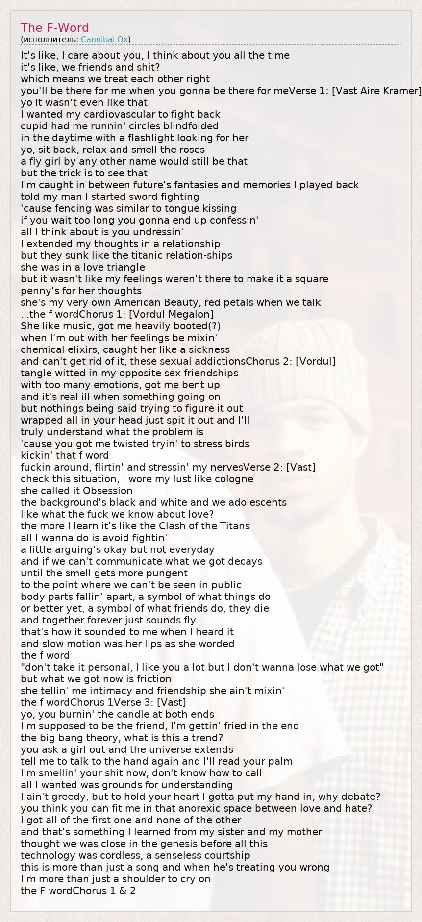 Это интересно:Cannibal Ox это дуэт двух гарлемских МС, решивших что их слова как острые лезвия режут всех рэпперов на их пути.состав:Vast Aire Vordul Mega (also known as Vordul Megallah)DJ Cip OneCannibal Ox это хип-хоп, основанный на реальной жизни, как сводки с передовой, и в то же время это искренность, интеллект и уровень мастерства, который... продолжение