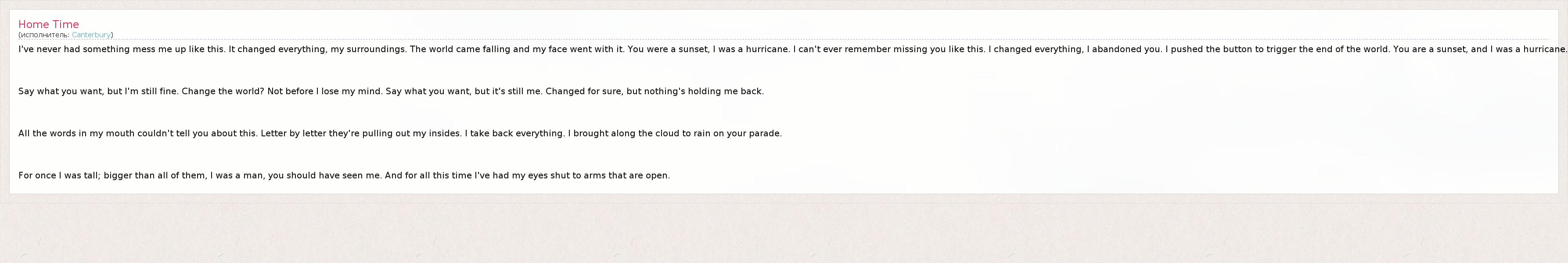 I've never had something mess me up like this. It changed everything, my surroundings. The world came falling and my face went with it. You were a sunset, I was a hurricane. I can't ever remember missing you like this. I changed everything, I abandoned you. I pushed the button to trigger the end of the world. You are a sunset, and I was a hurricane. Say what you want, but I'm still fine. Change the world? Not before I lose my mind. Say what you want, but it's still me. Changed for sure, but nothing's holding me back. All the words in my mouth couldn't tell you about this. Letter by letter they're pulling out my insides. I take back everything. I brought along the cloud to rain on your parade. For once I was tall; bigger than all of them, I was a man, you should have seen me. And for all this time I've had my eyes shut to arms that are open.