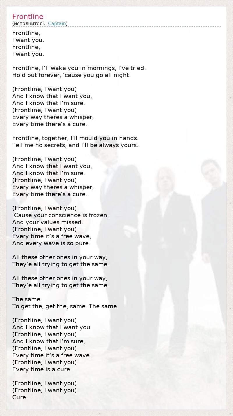 Frontline, I want you. Frontline, I want you. Frontline, I'll wake you in mornings, I've tried. Hold out forever, 'cause you go all night. (Frontline, I want you) And I know that I want you, And I know that I'm sure. (Frontline, I want you) Every way theres a whisper, Every time there's a cure. Frontline, together, I'll mould you in hands. Tell me no secrets, and I'll be always yours. (Frontline, I want you) And I know that I want you, And I know that I'm sure. (Frontline, I want you) Every way theres a whisper, Every time there's a cure. (Frontline, I want you) 'Cause your conscience is frozen, And your values missed. (Frontline, I want you) Every time it's a free wave, And every wave is so pure. All these other ones in your way, They'e all trying to get the same. All these other ones in your way, They'e all trying to get the same. The same, To get the, get the, same. The same. (Frontline, I want you) And I know that I want you (Frontline, I want you) And I know that I'm sure, (Frontline, I want you) Every time it's a free wave. (Frontline, I want you) Every time is a cure. (Frontline, I want you) (Frontline, I want you) Cure.