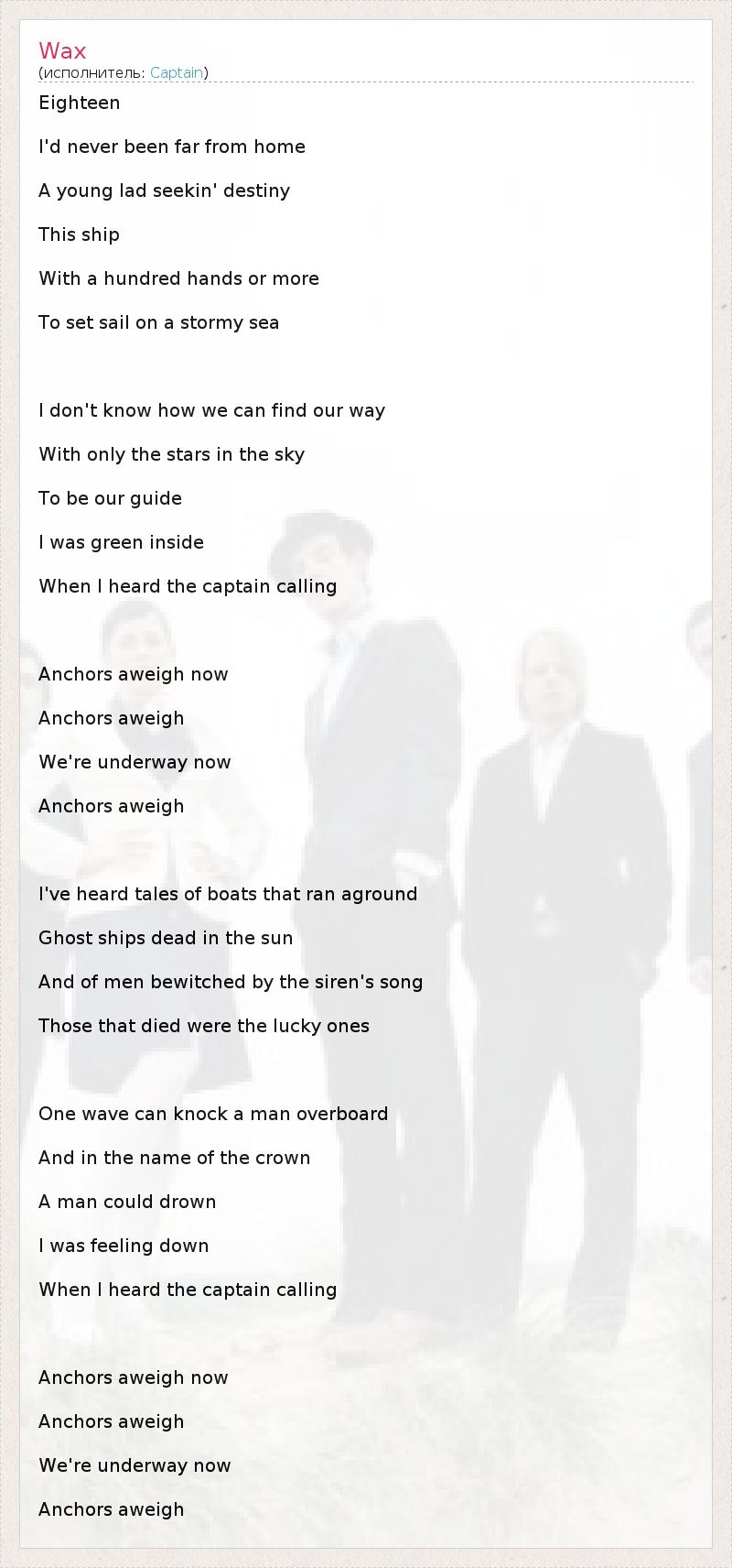 Eighteen I'd never been far from home A young lad seekin' destiny This ship With a hundred hands or more To set sail on a stormy sea I don't know how we can find our way With only the stars in the sky To be our guide I was green inside When I heard the captain calling Anchors aweigh now Anchors aweigh We're underway now Anchors aweigh I've heard tales of boats that ran aground Ghost ships dead in the sun And of men bewitched by the siren's song Those that died were the lucky ones One wave can knock a man overboard And in the name of the crown A man could drown I was feeling down When I heard the captain calling Anchors aweigh now Anchors aweigh We're underway now Anchors aweigh