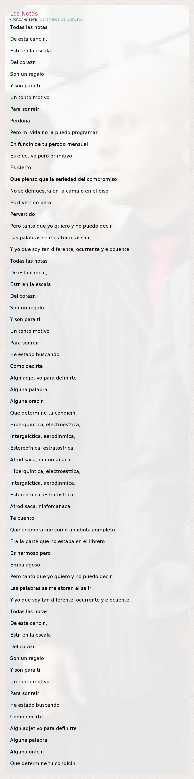 Todas las notas De esta cancin, Estn en la escala Del corazn Son un regalo Y son para ti Un tonto motivo Para sonreir Perdona Pero mi vida no la puedo programar En funcin de tu perodo mensual Es efectivo pero primitivo Es cierto Que pienso que la seriedad del compromiso No se demuestra en la cama o en el piso Es divertido pero Pervertido Pero tanto que yo quiero y no puedo decir Las palabras se me atoran al salir Y yo que soy tan diferente, ocurrente y elocuente Todas las notas De esta cancin, Estn en la escala Del corazn Son un regalo Y son para ti Un tonto motivo Para sonreir He estado buscando Como decirte Algn adjetivo para definirte Alguna palabra Alguna oracin Que determine tu condicin: Hiperquintica, electroesttica, Intergalctica, aerodinmica, Estereofnica, estratosfrica, Afrodisaca, ninfomanaca Hiperquintica, electroesttica, Intergalctica, aerodinmica, Estereofnica, estratosfrica, Afrodisaca, ninfomanaca Te cuento Que enamorarme como un idiota completo Era la parte que no estaba en el libreto Es hermoso pero Empalagoso Pero tanto que yo quiero y no puedo decir Las palabras se me atoran al salir Y yo que soy tan diferente, ocurrente y elocuente Todas las notas De esta cancin, Estn en la escala Del corazn Son un regalo Y son para ti Un tonto motivo Para sonreir He estado buscando Como decirte Algn adjetivo para definirte Alguna palabra Alguna oracin Que determine tu condicin