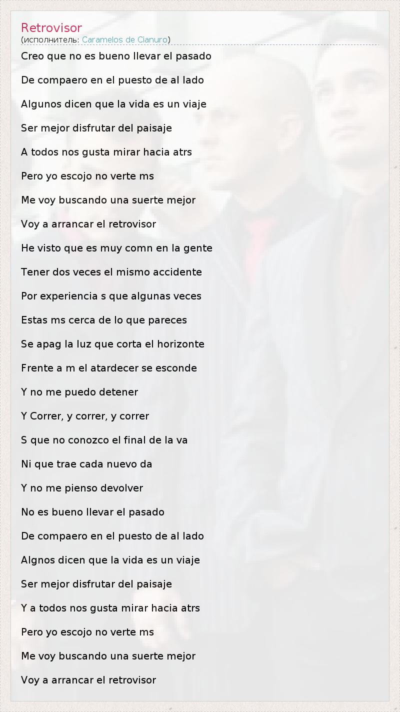 Creo que no es bueno llevar el pasado De compaero en el puesto de al lado Algunos dicen que la vida es un viaje Ser mejor disfrutar del paisaje A todos nos gusta mirar hacia atrs Pero yo escojo no verte ms Me voy buscando una suerte mejor Voy a arrancar el retrovisor He visto que es muy comn en la gente Tener dos veces el mismo accidente Por experiencia s que algunas veces Estas ms cerca de lo que pareces Se apag la luz que corta el horizonte Frente a m el atardecer se esconde Y no me puedo detener Y Correr, y correr, y correr S que no conozco el final de la va Ni que trae cada nuevo da Y no me pienso devolver No es bueno llevar el pasado De compaero en el puesto de al lado Algnos dicen que la vida es un viaje Ser mejor disfrutar del paisaje Y a todos nos gusta mirar hacia atrs Pero yo escojo no verte ms Me voy buscando una suerte mejor Voy a arrancar el retrovisor