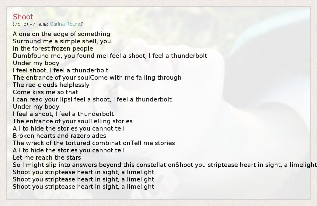 Alone on the edge of something Surround me a simple shell, you In the forest frozen people Dumbfound me, you found meI feel a shoot, I feel a thunderbolt Under my body I feel shoot, I feel a thunderbolt The entrance of your soulCome with me falling through The red clouds helplessly Come kiss me so that I can read your lipsI feel a shoot, I feel a thunderbolt Under my body I feel a shoot, I feel a thunderbolt The entrance of your soulTelling stories All to hide the stories you cannot tell Broken hearts and razorblades The wreck of the tortured combinationTell me stories All to hide the stories you cannot tell Let me reach the stars So I might slip into answers beyond this constellationShoot you striptease heart in sight, a limelight Shoot you striptease heart in sight, a limelight Shoot you striptease heart in sight, a limelight Shoot you striptease heart in sight, a limelight