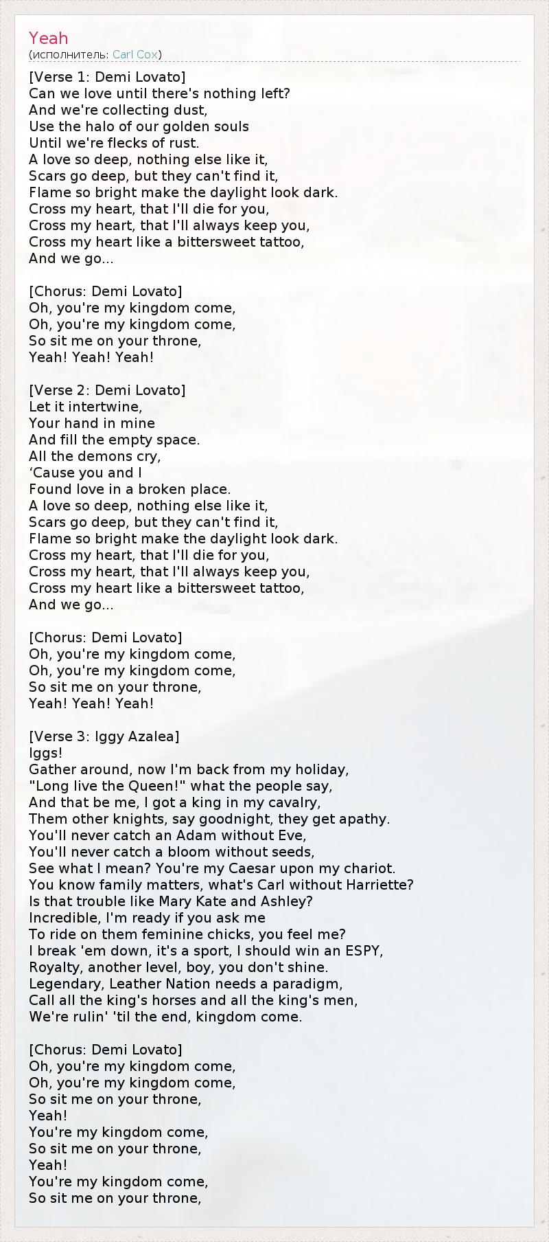 [Куплет 1: Demi Lovato] Можем ли мы любить без остатка? Или мы уже пылимся, Тратим блеск своих драгоценных душ, Пока не покроемся ржавчиной. Любовь так глубока, не похожа ни на что другое, Раны глубоки, но другим их не увидеть, Пламя страсти так ярко, что затмевает свет дня. Я клянусь, что умру за тебя, Я клянусь, что всегда буду беречь тебя, Я клянусь, это и приятый, и трудный обет, И мы начинаем... [Припев: Demi Lovato] О, ты для меня рай на земле, О, для меня наступает царствие твоё, Так усади меня на свой престол, Да! да! да! [Куплет 2: Demi Lovato] Пусть они переплетутся, Заполнят пустоту: Твоя рука в моей. Все демоны рыдают, Ведь ты и я Нашли любовь среди руин. Любовь так глубока, не похожа ни на что другое, Раны глубоки, но другим их не увидеть, Пламя страсти так ярко, что затмевает свет дня. Я клянусь, что умру за тебя, Я клянусь, что всегда буду беречь тебя, Я клянусь, это и приятый, и трудный обет, И мы начинаем... [Припев: Demi Lovato] О, ты для меня рай на земле, О, для меня наступает царствие твоё, Так усади меня на свой престол, Да! да! да! [Куплет 3: Iggy Azalea] Иггз! Собирайтесь вокруг меня, я вернулась из отпуска. "Да здравствует королева!" — кричит народ, Это я, в моей кавалерии есть король, Спокойной ночи остальным рыцарям, они грустнеют. Вы никогда не увидите Адама без Евы, Вы никогда не увидите цветов без семян, Понимаете, о чём я? Ты кесарь на моёй колеснице. Знаешь, это дела семейные: кто такой Карл без Гарриетт? 1 Это неприятность, как Мэри-Кейт и Эшли? 2 Невероятна, если попросишь, то я готова Наехать на этих изнеженных девчонок, просекаешь? Я одолею их, это спорт, мне должны вручить кубок, Величие нового уровня, парень, а ты не блещешь. Легендарна, доминам нужен пример для подражания, Позвать всю королевскую конницу и всю королевскую рать, Мы будем править всю жизнь, грядёт царствие. [Припев: Demi Lovato] О, ты для меня рай на земле, О, для меня наступает царствие твоё, Так усади меня на свой престол, Да! Для меня наступает царствие твоё, Так усади меня на свой престол, Да! Для меня наступает царствие твоё, Так усади меня на свой престол. 1 — "Дела семейные" — американский комедийный телесериал, который транслировался на телеканале ABC с 1989 по 1997 год, а затем на CBS с 1997 по1998 год. Карл и Гарриетт Уинслоу — вымышленная афроамериканская супружеская чета, главные персонажи этого ситкома. 2 — Мэри-Кейт и Эшли Фуллер Олсен — американские актрисы и дизайнеры одежды