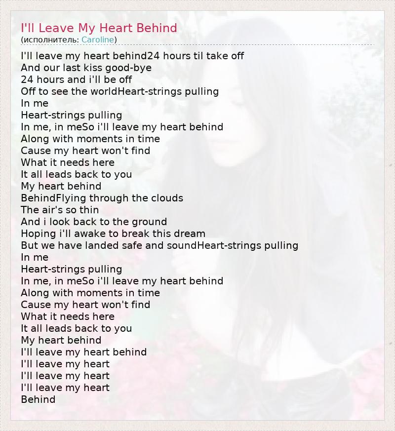 I'll leave my heart behind24 hours til take off And our last kiss good-bye 24 hours and i'll be off Off to see the worldHeart-strings pulling In me Heart-strings pulling In me, in meSo i'll leave my heart behind Along with moments in time Cause my heart won't find What it needs here It all leads back to you My heart behind BehindFlying through the clouds The air's so thin And i look back to the ground Hoping i'll awake to break this dream But we have landed safe and soundHeart-strings pulling In me Heart-strings pulling In me, in meSo i'll leave my heart behind Along with moments in time Cause my heart won't find What it needs here It all leads back to you My heart behind I'll leave my heart behind I'll leave my heart I'll leave my heart I'll leave my heart Behind