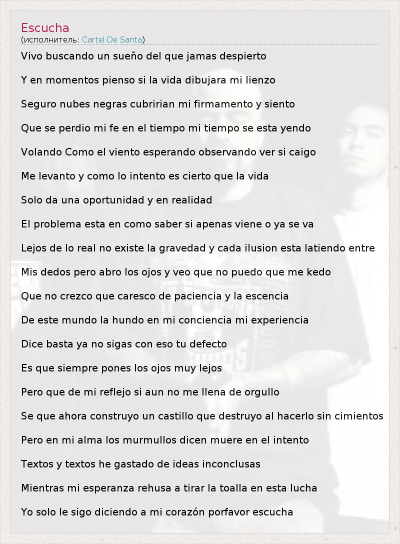 Vivo buscando un sueño del que jamas despierto Y en momentos pienso si la vida dibujara mi lienzo Seguro nubes negras cubririan mi firmamento y siento Que se perdio mi fe en el tiempo mi tiempo se esta yendo Volando Como el viento esperando observando ver si caigo Me levanto y como lo intento es cierto que la vida Solo da una oportunidad y en realidad El problema esta en como saber si apenas viene o ya se va Lejos de lo real no existe la gravedad y cada ilusion esta latiendo entre Mis dedos pero abro los ojos y veo que no puedo que me kedo Que no crezco que caresco de paciencia y la escencia De este mundo la hundo en mi conciencia mi experiencia Dice basta ya no sigas con eso tu defecto Es que siempre pones los ojos muy lejos Pero que de mi reflejo si aun no me llena de orgullo Se que ahora construyo un castillo que destruyo al hacerlo sin cimientos Pero en mi alma los murmullos dicen muere en el intento Textos y textos he gastado de ideas inconclusas Mientras mi esperanza rehusa a tirar la toalla en esta lucha Yo solo le sigo diciendo a mi corazón porfavor escucha