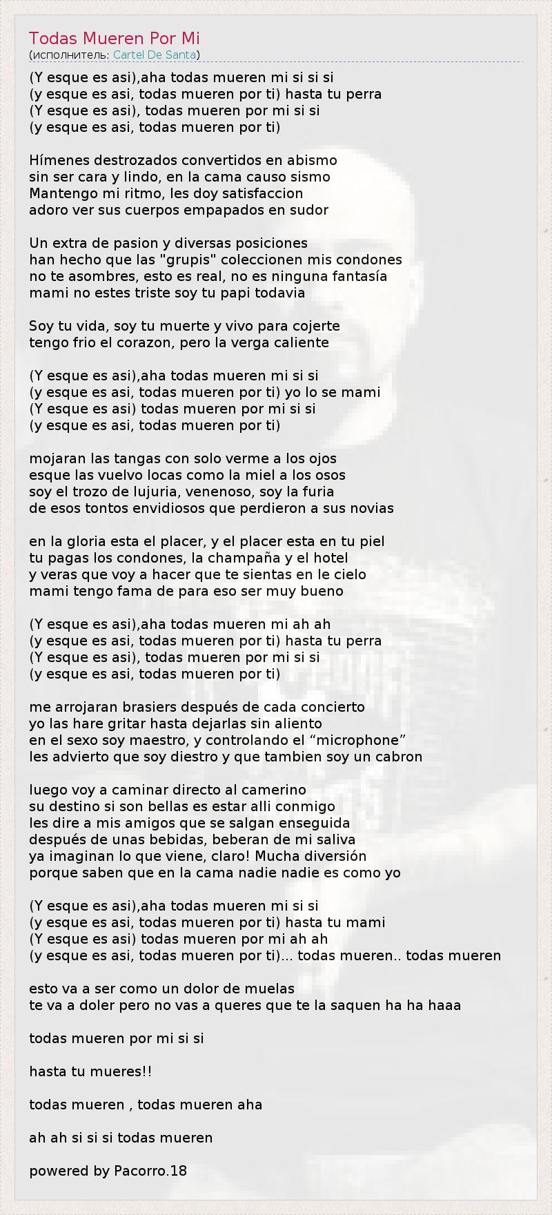 (Y esque es asi),aha todas mueren mi si si si (y esque es asi, todas mueren por ti) hasta tu perra (Y esque es asi), todas mueren por mi si si (y esque es asi, todas mueren por ti) Hímenes destrozados convertidos en abismo sin ser cara y lindo, en la cama causo sismo Mantengo mi ritmo, les doy satisfaccion adoro ver sus cuerpos empapados en sudor Un extra de pasion y diversas posiciones han hecho que las "grupis" coleccionen mis condones no te asombres, esto es real, no es ninguna fantasía mami no estes triste soy tu papi todavia Soy tu vida, soy tu muerte y vivo para cojerte tengo frio el corazon, pero la verga caliente (Y esque es asi),aha todas mueren mi si si (y esque es asi, todas mueren por ti) yo lo se mami (Y esque es asi) todas mueren por mi si si (y esque es asi, todas mueren por ti) mojaran las tangas con solo verme a los ojos esque las vuelvo locas como la miel a los osos soy el trozo de lujuria, venenoso, soy la furia de esos tontos envidiosos que perdieron a sus novias en la gloria esta el placer, y el placer esta en tu piel tu pagas los condones, la champaña y el hotel y veras que voy a hacer que te sientas en le cielo mami tengo fama de para eso ser muy bueno (Y esque es asi),aha todas mueren mi ah ah (y esque es asi, todas mueren por ti) hasta tu perra (Y esque es asi), todas mueren por mi si si (y esque es asi, todas mueren por ti) me arrojaran brasiers después de cada concierto yo las hare gritar hasta dejarlas sin aliento en el sexo soy maestro, y controlando el “microphone” les advierto que soy diestro y que tambien soy un cabron luego voy a caminar directo al camerino su destino si son bellas es estar alli conmigo les dire a mis amigos que se salgan enseguida después de unas bebidas, beberan de mi saliva ya imaginan lo que viene, claro! Mucha diversión porque saben que en la cama nadie nadie es como yo (Y esque es asi),aha todas mueren mi si si (y esque es asi, todas mueren por ti) hasta tu mami (Y esque es asi) todas mueren por mi ah ah (y esque es asi, todas mueren por ti)... todas mueren.. todas mueren esto va a ser como un dolor de muelas te va a doler pero no vas a queres que te la saquen ha ha haaa todas mueren por mi si si hasta tu mueres!! todas mueren , todas mueren aha ah ah si si si todas mueren powered by Pacorro.18