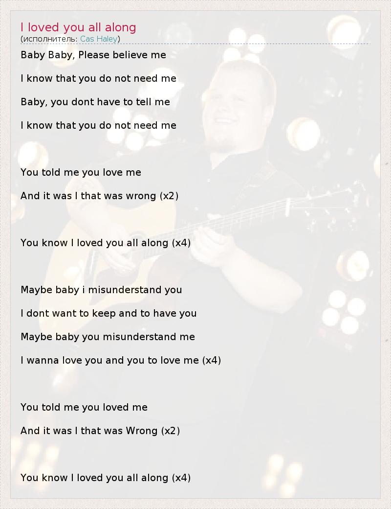 Baby Baby, Please believe me I know that you do not need me Baby, you dont have to tell me I know that you do not need me You told me you love me And it was I that was wrong (x2) You know I loved you all along (x4) Maybe baby i misunderstand you I dont want to keep and to have you Maybe baby you misunderstand me I wanna love you and you to love me (x4) You told me you loved me And it was I that was Wrong (x2) You know I loved you all along (x4)