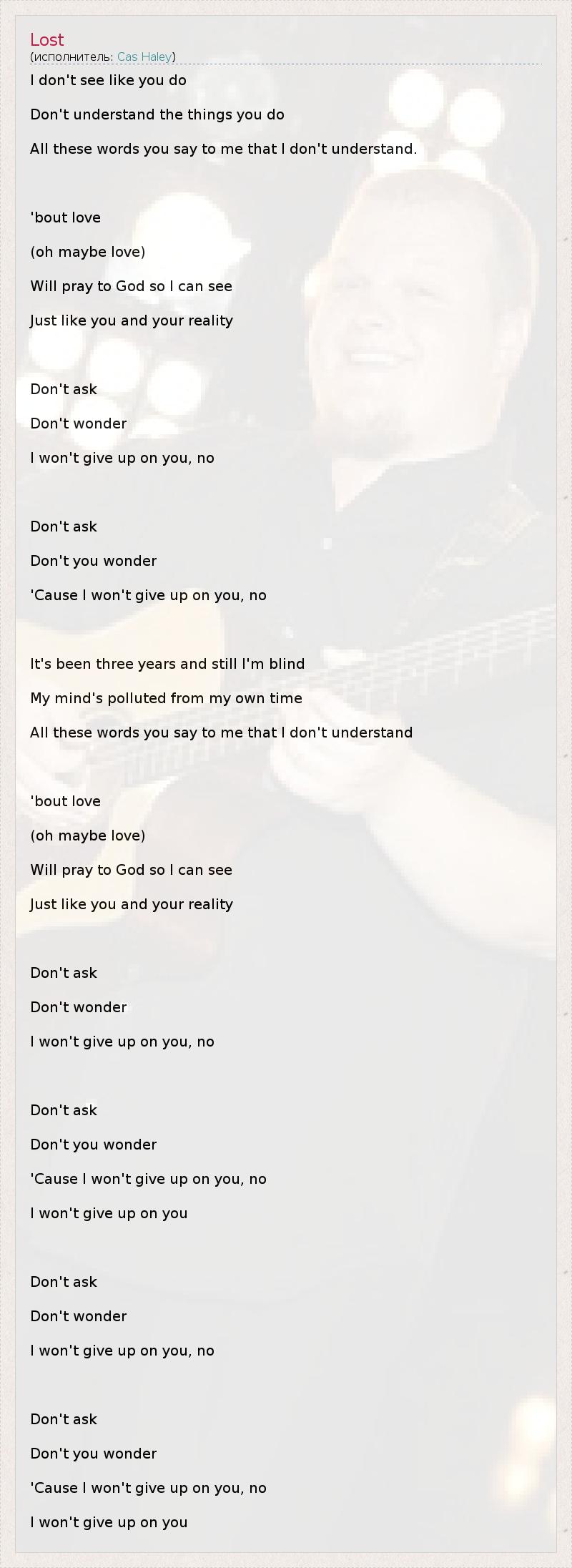 I don't see like you do Don't understand the things you do All these words you say to me that I don't understand. 'bout love (oh maybe love) Will pray to God so I can see Just like you and your reality Don't ask Don't wonder I won't give up on you, no Don't ask Don't you wonder 'Cause I won't give up on you, no It's been three years and still I'm blind My mind's polluted from my own time All these words you say to me that I don't understand 'bout love (oh maybe love) Will pray to God so I can see Just like you and your reality Don't ask Don't wonder I won't give up on you, no Don't ask Don't you wonder 'Cause I won't give up on you, no I won't give up on you Don't ask Don't wonder I won't give up on you, no Don't ask Don't you wonder 'Cause I won't give up on you, no I won't give up on you