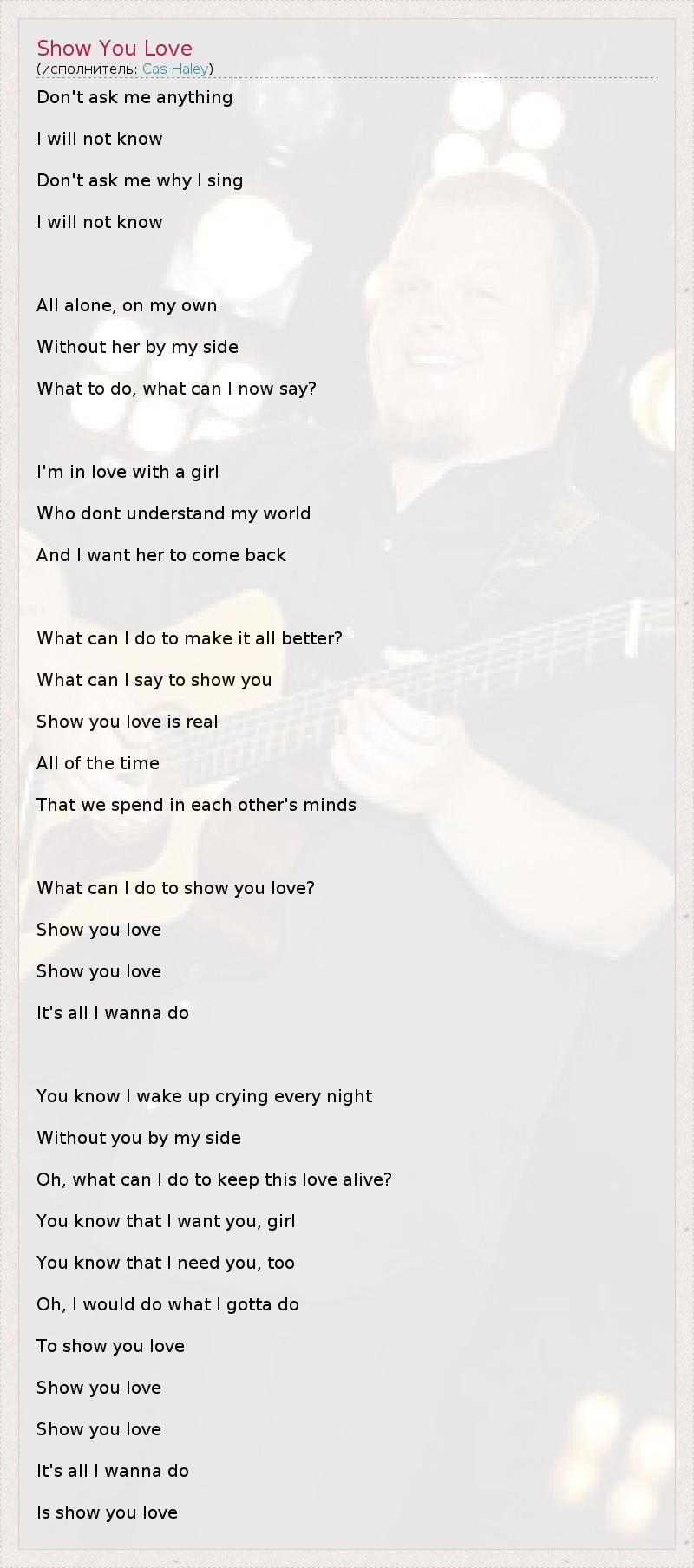 Don't ask me anything I will not know Don't ask me why I sing I will not know All alone, on my own Without her by my side What to do, what can I now say? I'm in love with a girl Who dont understand my world And I want her to come back What can I do to make it all better? What can I say to show you Show you love is real All of the time That we spend in each other's minds What can I do to show you love? Show you love Show you love It's all I wanna do You know I wake up crying every night Without you by my side Oh, what can I do to keep this love alive? You know that I want you, girl You know that I need you, too Oh, I would do what I gotta do To show you love Show you love Show you love It's all I wanna do Is show you love