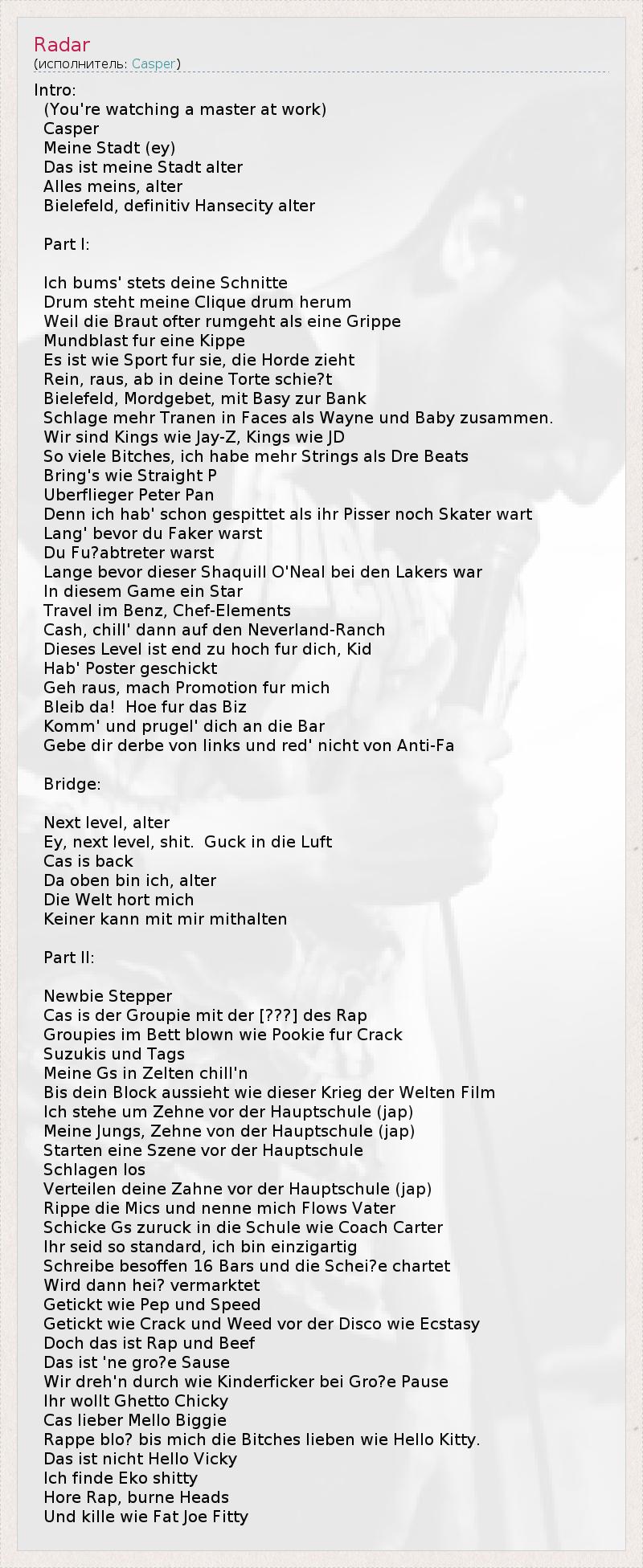 Это интересно:Бенджамин Гриффи, более известный как «Casper», - немецкий рэппер из Билефельда. Каспер начал писать стихи, ещё будучи ребёнком, когда жил в Августе, штат Джорджия. Позже его мать решает переехать в Германию. После этого Каспер сосредоточился на металкор-группе в течение двух лет, "A Fear Called Treason".Через некоторое время ( в 2006 году) записал хип-хоп диск "Die Welt Hort Mich". 9 мая 2008 года, Каспер... продолжение