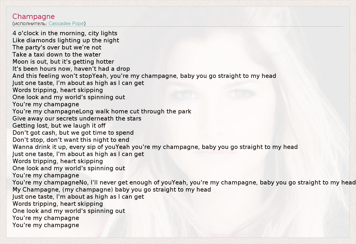 4 o'clock in the morning, city lights Like diamonds lighting up the night The party's over but we're not Take a taxi down to the water Moon is out, but it's getting hotter It's been hours now, haven't had a drop And this feeling won't stopYeah, you're my champagne, baby you go straight to my head Just one taste, I'm about as high as I can get Words tripping, heart skipping One look and my world's spinning out You're my champagne You're my champagneLong walk home cut through the park Give away our secrets underneath the stars Getting lost, but we laugh it off Don't got cash, but we got time to spend Don't stop, don't want this night to end Wanna drink it up, every sip of youYeah you're my champagne, baby you go straight to my head Just one taste, I'm about as high as I can get Words tripping, heart skipping One look and my world's spinning out You're my champagne You're my champagneNo, I'll never get enough of youYeah, you're my champagne, baby you go straight to my head My Champagne, (my champagne) baby you go straight to my head Just one taste, I'm about as high as I can get Words tripping, heart skipping One look and my world's spinning out You're my champagne You're my champagne