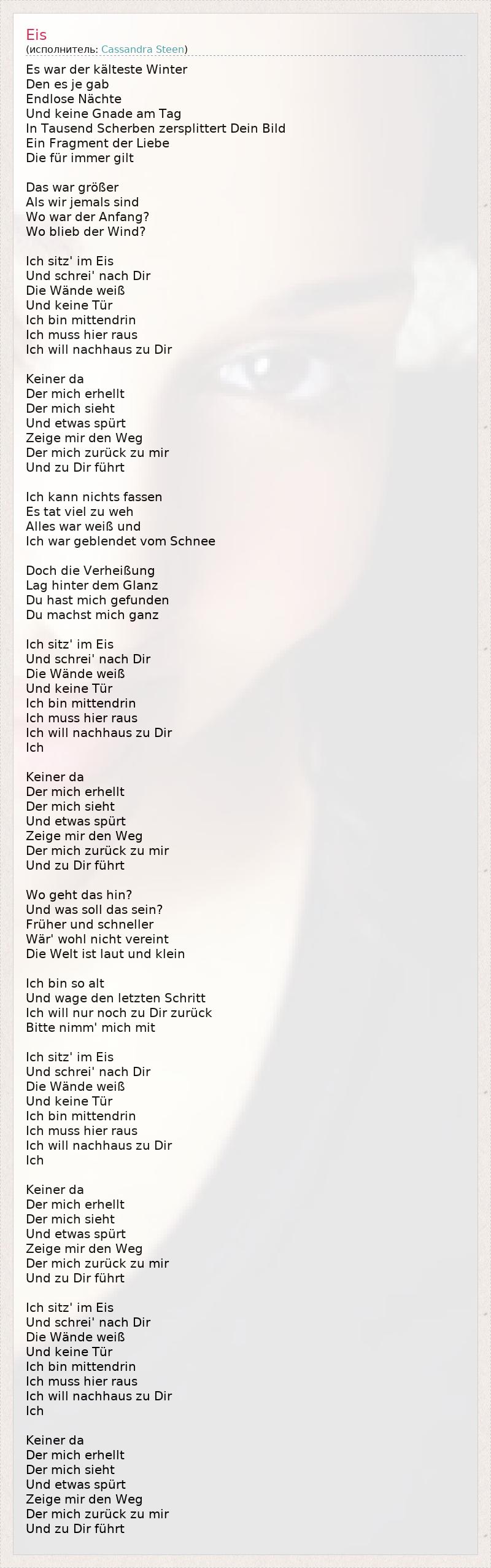 Es war der kälteste Winter Den es je gab Endlose Nächte Und keine Gnade am Tag In Tausend Scherben zersplittert Dein Bild Ein Fragment der Liebe Die für immer gilt Das war größer Als wir jemals sind Wo war der Anfang? Wo blieb der Wind? Ich sitz' im Eis Und schrei' nach Dir Die Wände weiß Und keine Tür Ich bin mittendrin Ich muss hier raus Ich will nachhaus zu Dir Keiner da Der mich erhellt Der mich sieht Und etwas spürt Zeige mir den Weg Der mich zurück zu mir Und zu Dir führt Ich kann nichts fassen Es tat viel zu weh Alles war weiß und Ich war geblendet vom Schnee Doch die Verheißung Lag hinter dem Glanz Du hast mich gefunden Du machst mich ganz Ich sitz' im Eis Und schrei' nach Dir Die Wände weiß Und keine Tür Ich bin mittendrin Ich muss hier raus Ich will nachhaus zu Dir Ich Keiner da Der mich erhellt Der mich sieht Und etwas spürt Zeige mir den Weg Der mich zurück zu mir Und zu Dir führt Wo geht das hin? Und was soll das sein? Früher und schneller Wär' wohl nicht vereint Die Welt ist laut und klein Ich bin so alt Und wage den letzten Schritt Ich will nur noch zu Dir zurück Bitte nimm' mich mit Ich sitz' im Eis Und schrei' nach Dir Die Wände weiß Und keine Tür Ich bin mittendrin Ich muss hier raus Ich will nachhaus zu Dir Ich Keiner da Der mich erhellt Der mich sieht Und etwas spürt Zeige mir den Weg Der mich zurück zu mir Und zu Dir führt Ich sitz' im Eis Und schrei' nach Dir Die Wände weiß Und keine Tür Ich bin mittendrin Ich muss hier raus Ich will nachhaus zu Dir Ich Keiner da Der mich erhellt Der mich sieht Und etwas spürt Zeige mir den Weg Der mich zurück zu mir Und zu Dir führt