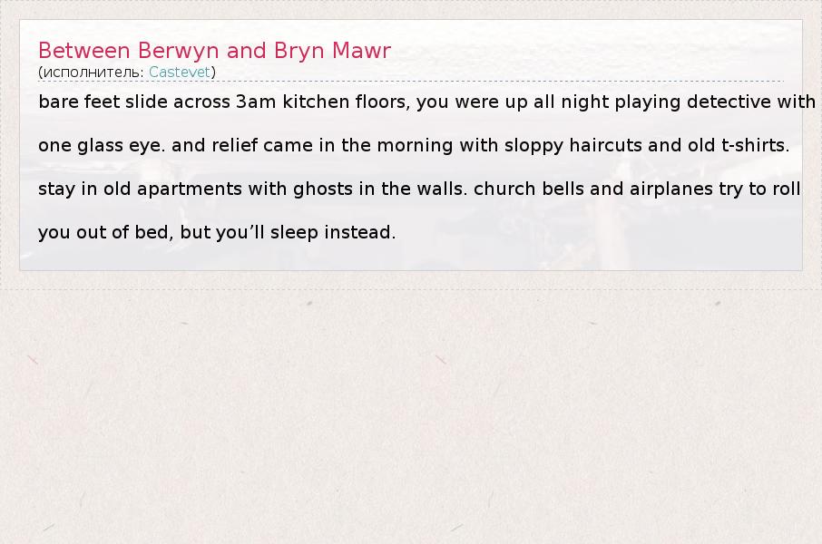 ГлавнаяИсполнителиCastevetBetween Berwyn and Bryn Mawr