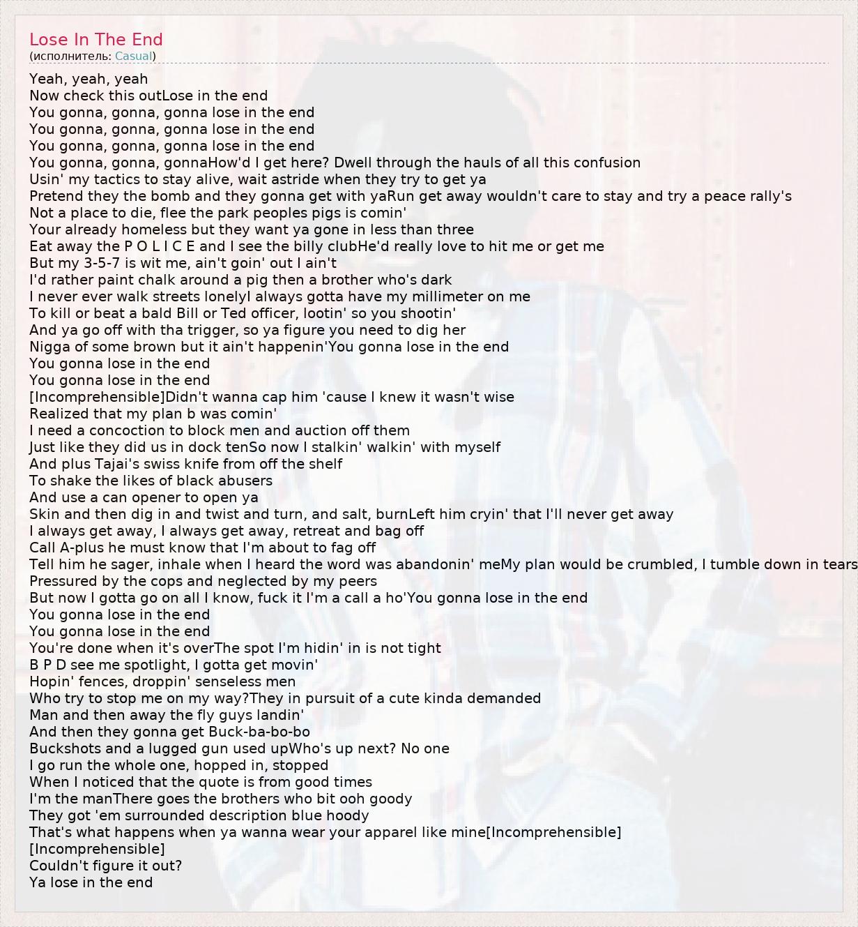 Yeah, yeah, yeah Now check this outLose in the end You gonna, gonna, gonna lose in the end You gonna, gonna, gonna lose in the end You gonna, gonna, gonna lose in the end You gonna, gonna, gonnaHow'd I get here? Dwell through the hauls of all this confusion Usin' my tactics to stay alive, wait astride when they try to get ya Pretend they the bomb and they gonna get with yaRun get away wouldn't care to stay and try a peace rally's Not a place to die, flee the park peoples pigs is comin' Your already homeless but they want ya gone in less than three Eat away the P O L I C E and I see the billy clubHe'd really love to hit me or get me But my 3-5-7 is wit me, ain't goin' out I ain't I'd rather paint chalk around a pig then a brother who's dark I never ever walk streets lonelyI always gotta have my millimeter on me To kill or beat a bald Bill or Ted officer, lootin' so you shootin' And ya go off with tha trigger, so ya figure you need to dig her Nigga of some brown but it ain't happenin'You gonna lose in the end You gonna lose in the end You gonna lose in the end [Incomprehensible]Didn't wanna cap him 'cause I knew it wasn't wise Realized that my plan b was comin' I need a concoction to block men and auction off them Just like they did us in dock tenSo now I stalkin' walkin' with myself And plus Tajai's swiss knife from off the shelf To shake the likes of black abusers And use a can opener to open ya Skin and then dig in and twist and turn, and salt, burnLeft him cryin' that I'll never get away I always get away, I always get away, retreat and bag off Call A-plus he must know that I'm about to fag off Tell him he sager, inhale when I heard the word was abandonin' meMy plan would be crumbled, I tumble down in tears Pressured by the cops and neglected by my peers But now I gotta go on all I know, fuck it I'm a call a ho'You gonna lose in the end You gonna lose in the end You gonna lose in the end You're done when it's overThe spot I'm hidin' in is not tight B P D see me spotlight, I gotta get movin' Hopin' fences, droppin' senseless men Who try to stop me on my way?They in pursuit of a cute kinda demanded Man and then away the fly guys landin' And then they gonna get Buck-ba-bo-bo Buckshots and a lugged gun used upWho's up next? No one I go run the whole one, hopped in, stopped When I noticed that the quote is from good times I'm the manThere goes the brothers who bit ooh goody They got 'em surrounded description blue hoody That's what happens when ya wanna wear your apparel like mine[Incomprehensible] [Incomprehensible] Couldn't figure it out? Ya lose in the end