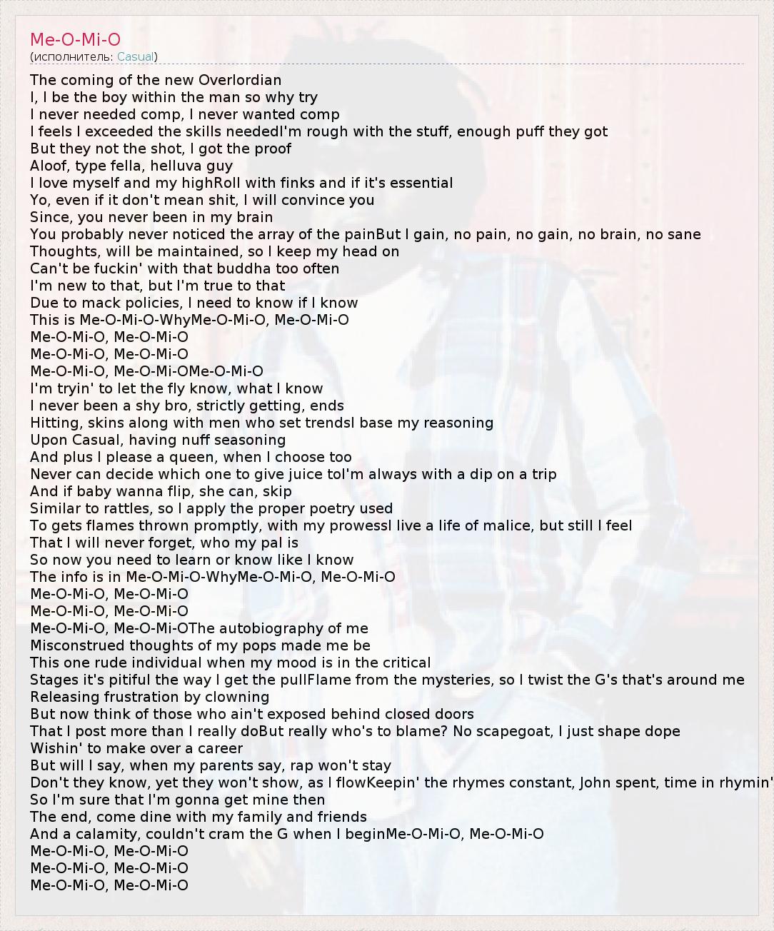 And a calamity, couldn't cram the G when I beginMe-O-Mi-O, Me-O-Mi-O