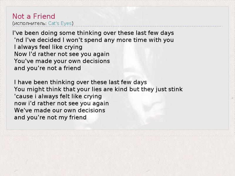 I've been doing some thinking over these last few days 'nd I've decided I won't spend any more time with you I always feel like crying Now I'd rather not see you again You've made your own decisions and you're not a friend I have been thinking over these last few days You might think that your lies are kind but they just stink 'cause i always felt like crying now i'd rather not see you again We've made our own decisions and you're not my friend