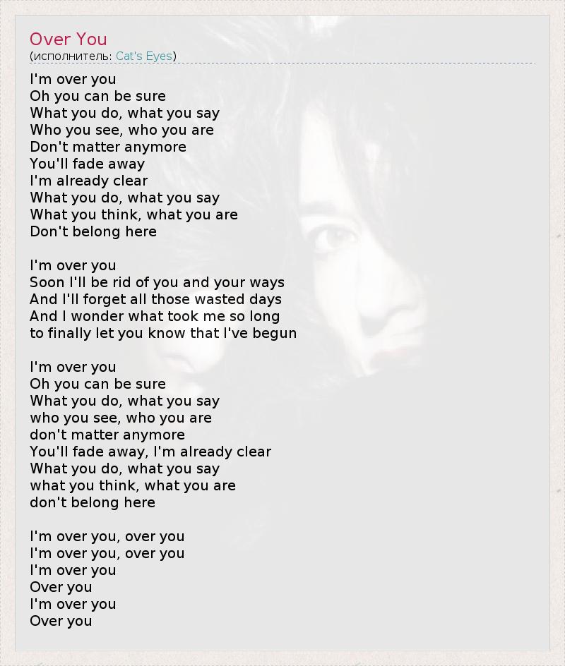I'm over you Oh you can be sure What you do, what you say Who you see, who you are Don't matter anymore You'll fade away I'm already clear What you do, what you say What you think, what you are Don't belong here I'm over you Soon I'll be rid of you and your ways And I'll forget all those wasted days And I wonder what took me so long to finally let you know that I've begun I'm over you Oh you can be sure What you do, what you say who you see, who you are don't matter anymore You'll fade away, I'm already clear What you do, what you say what you think, what you are don't belong here I'm over you, over you I'm over you, over you I'm over you Over you I'm over you Over you