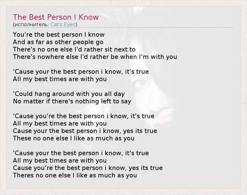 You're the best person I know And as far as other people go There's no one else I'd rather sit next to There's nowhere else I'd rather be when I'm with you 'Cause your the best person i know, it's true All my best times are with you 'Could hang around with you all day No matter if there's nothing left to say 'Cause you're the best person i know, it's true All my best times are with you Cause your the best person i know, yes its true These no one else I like as much as you 'Cause your the best person i know, it's true All my best times are with you Cause you're the best person i know, yes its true Theres no one else I like as much as you