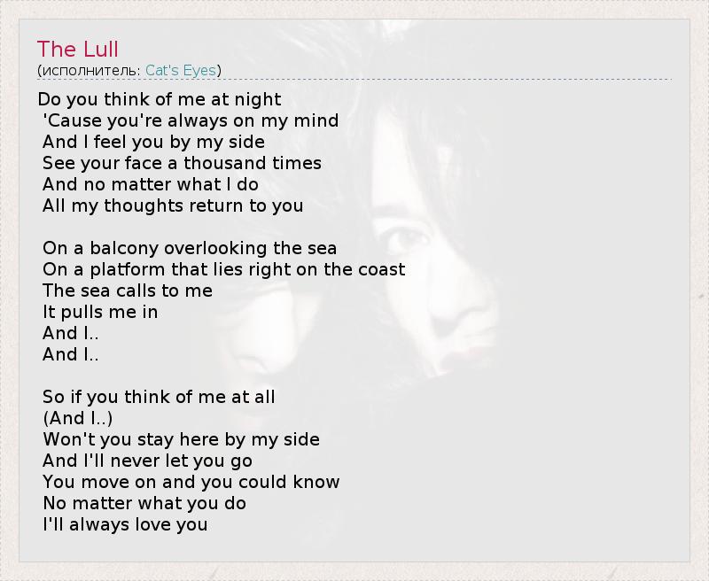 Ты думаешь обо мне ночью? 'Потому что я думаю о тебе всё время И я чувствую тебя рядом Вижу твоё лицо тысячу раз И неважно, что я делаю Все мои мысли возвращаются к тебе. На балконе, всматриваясь в море На платформе, что лежит прямо на побережье Море зовёт меня Оно тянет меня И я... И я... Итак, если ты вообще думаешь обо мне (И я ...) Не останешся ли ты здесь, рядом со мной И я никогда не дам тебе уйти Ты двигаешся и могла бы знать Я всегда буду любить тебя.