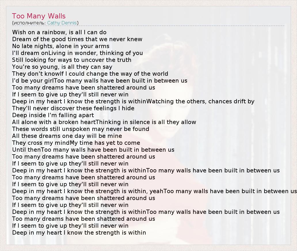 Wish on a rainbow, is all I can do Dream of the good times that we never knew No late nights, alone in your arms I'll dream onLiving in wonder, thinking of you Still looking for ways to uncover the truth You're so young, is all they can say They don't knowIf I could change the way of the world I'd be your girlToo many walls have been built in between us Too many dreams have been shattered around us If I seem to give up they'll still never win Deep in my heart I know the strength is withinWatching the others, chances drift by They'll never discover these feelings I hide Deep inside I'm falling apart All alone with a broken heartThinking in silence is all they allow These words still unspoken may never be found All these dreams one day will be mine They cross my mindMy time has yet to come Until thenToo many walls have been built in between us Too many dreams have been shattered around us If I seem to give up they'll still never win Deep in my heart I know the strength is withinToo many walls have been built in between us Too many dreams have been shattered around us If I seem to give up they'll still never win Deep in my heart I know the strength is within, yeahToo many walls have been built in between us Too many dreams have been shattered around us If I seem to give up they'll still never win Deep in my heart I know the strength is withinToo many walls have been built in between us Too many dreams have been shattered around us If I seem to give up they'll still never win Deep in my heart I know the strength is within