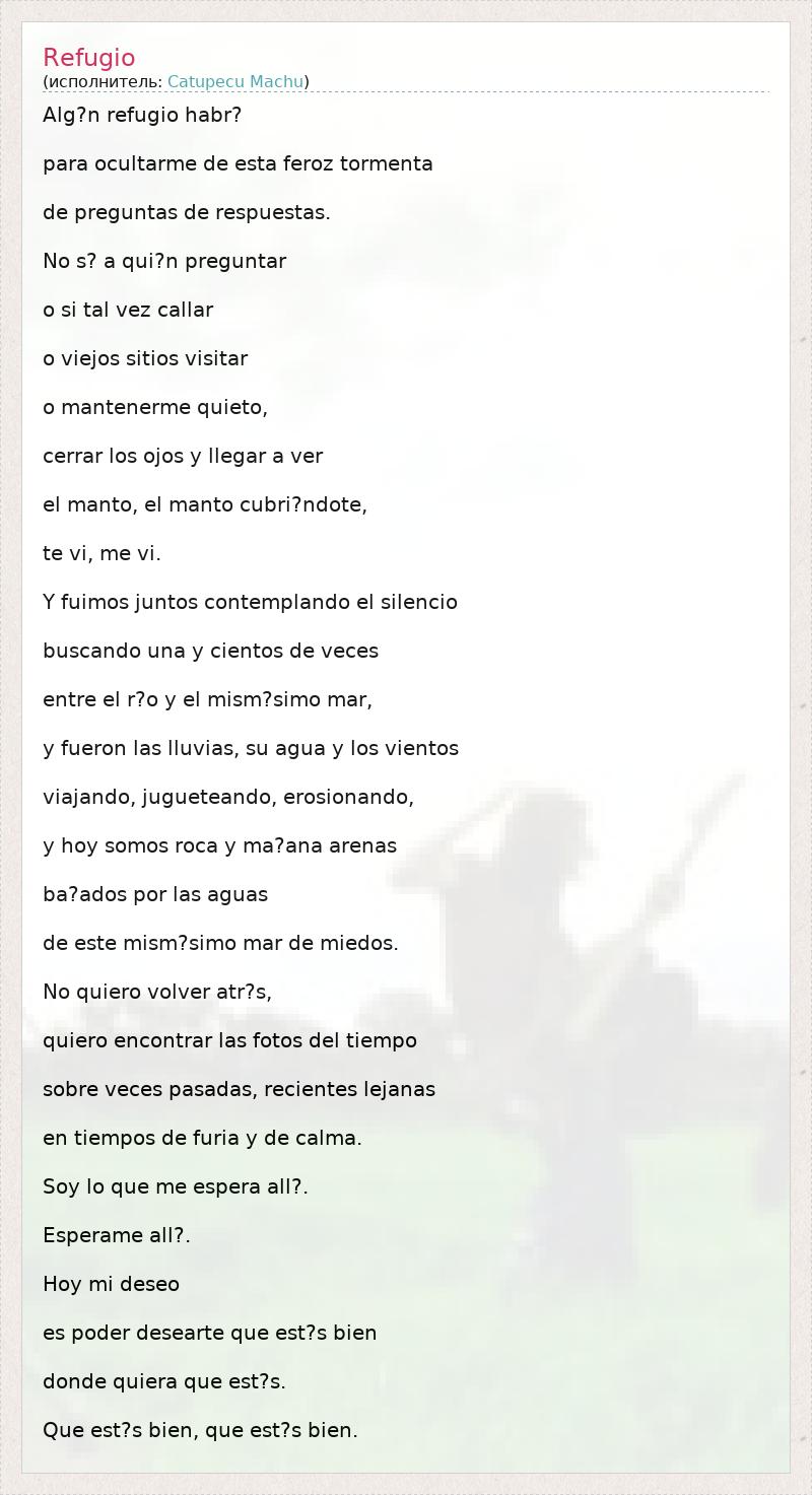 Alg?n refugio habr? para ocultarme de esta feroz tormenta de preguntas de respuestas. No s? a qui?n preguntar o si tal vez callar o viejos sitios visitar o mantenerme quieto, cerrar los ojos y llegar a ver el manto, el manto cubri?ndote, te vi, me vi. Y fuimos juntos contemplando el silencio buscando una y cientos de veces entre el r?o y el mism?simo mar, y fueron las lluvias, su agua y los vientos viajando, jugueteando, erosionando, y hoy somos roca y ma?ana arenas ba?ados por las aguas de este mism?simo mar de miedos. No quiero volver atr?s, quiero encontrar las fotos del tiempo sobre veces pasadas, recientes lejanas en tiempos de furia y de calma. Soy lo que me espera all?. Esperame all?. Hoy mi deseo es poder desearte que est?s bien donde quiera que est?s. Que est?s bien, que est?s bien.