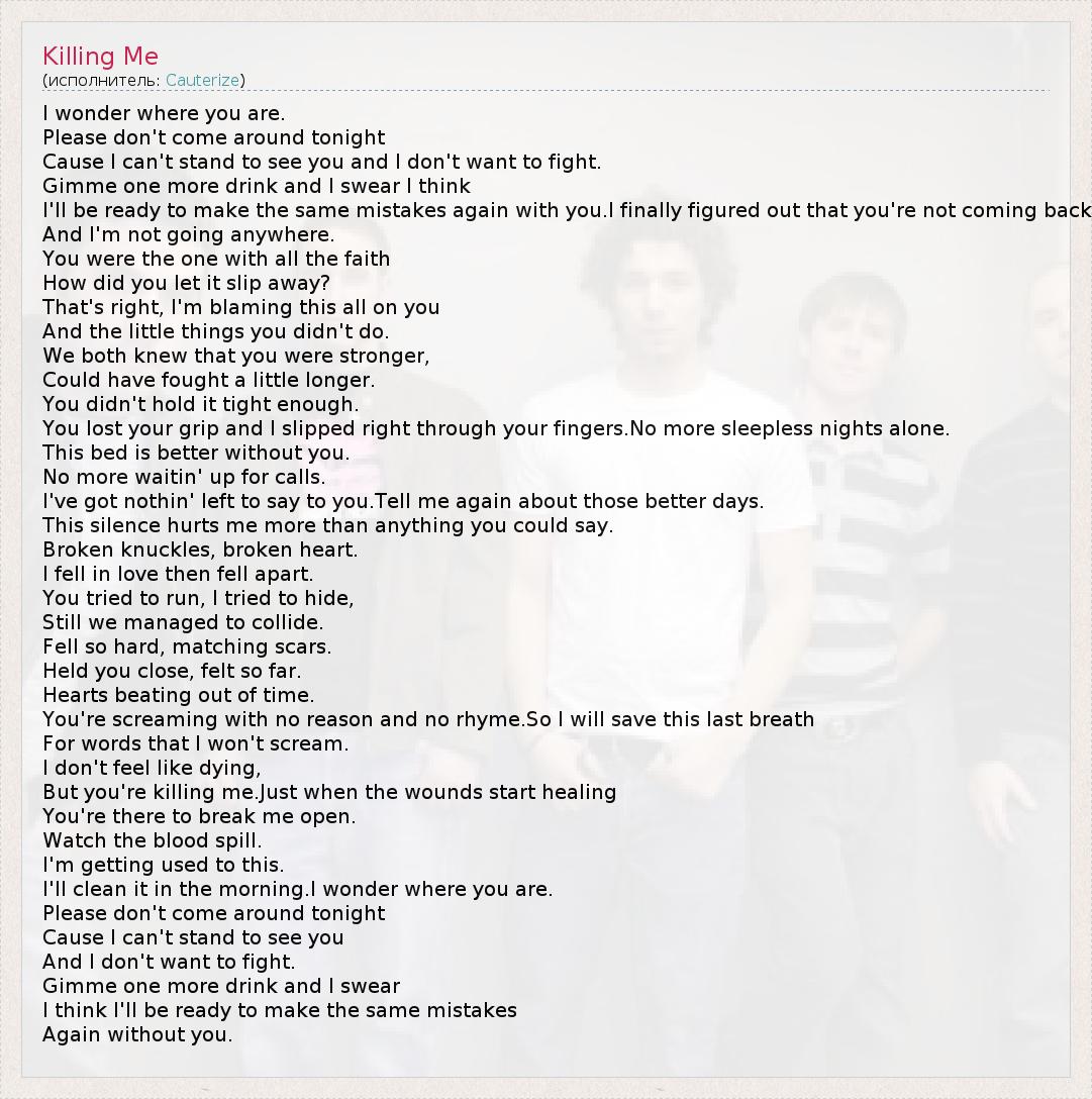I wonder where you are. Please don't come around tonight Cause I can't stand to see you and I don't want to fight. Gimme one more drink and I swear I think I'll be ready to make the same mistakes again with you.I finally figured out that you're not coming back And I'm not going anywhere. You were the one with all the faith How did you let it slip away? That's right, I'm blaming this all on you And the little things you didn't do. We both knew that you were stronger, Could have fought a little longer. You didn't hold it tight enough. You lost your grip and I slipped right through your fingers.No more sleepless nights alone. This bed is better without you. No more waitin' up for calls. I've got nothin' left to say to you.Tell me again about those better days. This silence hurts me more than anything you could say. Broken knuckles, broken heart. I fell in love then fell apart. You tried to run, I tried to hide, Still we managed to collide. Fell so hard, matching scars. Held you close, felt so far. Hearts beating out of time. You're screaming with no reason and no rhyme.So I will save this last breath For words that I won't scream. I don't feel like dying, But you're killing me.Just when the wounds start healing You're there to break me open. Watch the blood spill. I'm getting used to this. I'll clean it in the morning.I wonder where you are. Please don't come around tonight Cause I can't stand to see you And I don't want to fight. Gimme one more drink and I swear I think I'll be ready to make the same mistakes Again without you.