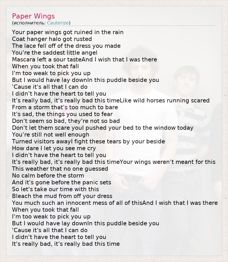 Your paper wings got ruined in the rain Coat hanger halo got rusted The lace fell off of the dress you made You're the saddest little angel Mascara left a sour tasteAnd I wish that I was there When you took that fall I'm too weak to pick you up But I would have lay downIn this puddle beside you 'Cause it's all that I can do I didn't have the heart to tell you It's really bad, it's really bad this timeLike wild horses running scared From a storm that's too much to bare It's sad, the things you used to fear Don't seem so bad, they're not so bad Don't let them scare youI pushed your bed to the window today You're still not well enough Turned visitors awayI fight these tears by your beside How dare I let you see me cry I didn't have the heart to tell you It's really bad, it's really bad this timeYour wings weren't meant for this This weather that no one guessed No calm before the storm And it's gone before the panic sets So let's take our time with this Bleach the mud from off your dress You much such an innocent mess of all of thisAnd I wish that I was there When you took that fall I'm too weak to pick you up But I would have lay downIn this puddle beside you 'Cause it's all that I can do I didn't have the heart to tell you It's really bad, it's really bad this time