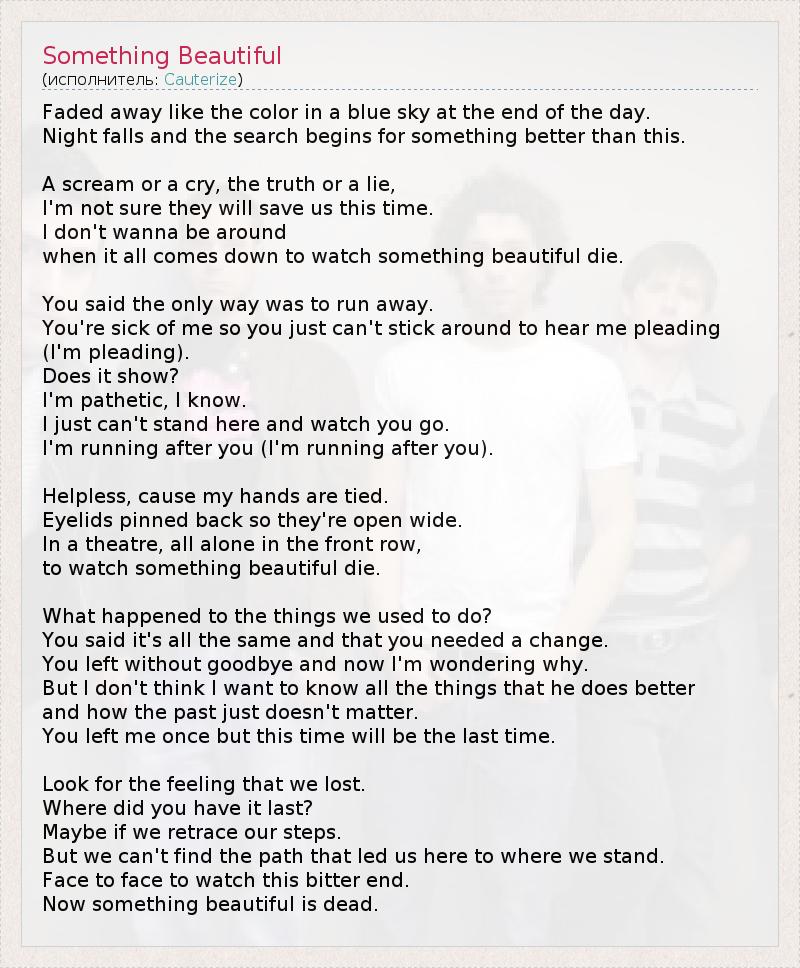Faded away like the color in a blue sky at the end of the day. Night falls and the search begins for something better than this. A scream or a cry, the truth or a lie, I'm not sure they will save us this time. I don't wanna be around when it all comes down to watch something beautiful die. You said the only way was to run away. You're sick of me so you just can't stick around to hear me pleading (I'm pleading). Does it show? I'm pathetic, I know. I just can't stand here and watch you go. I'm running after you (I'm running after you). Helpless, cause my hands are tied. Eyelids pinned back so they're open wide. In a theatre, all alone in the front row, to watch something beautiful die. What happened to the things we used to do? You said it's all the same and that you needed a change. You left without goodbye and now I'm wondering why. But I don't think I want to know all the things that he does better and how the past just doesn't matter. You left me once but this time will be the last time. Look for the feeling that we lost. Where did you have it last? Maybe if we retrace our steps. But we can't find the path that led us here to where we stand. Face to face to watch this bitter end. Now something beautiful is dead.