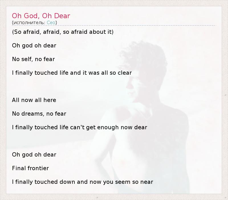 (So afraid, afraid, so afraid about it) Oh god oh dear No self, no fear I finally touched life and it was all so clear All now all here No dreams, no fear I finally touched life can't get enough now dear Oh god oh dear Final frontier I finally touched down and now you seem so near