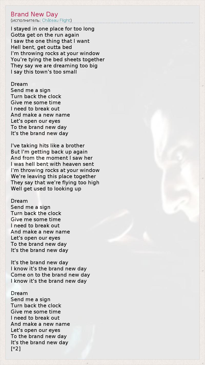 Я слишком долго был в одном месте, Теперь мне снова пора в путь. Я видел лишь то, что хотел, Эй, сорвиголова, вылезай из постели! Я кидаю камушки в твое окно, Ты вяжешь верёвку из простыней. Мы слишком о многом мечтаем, Послушай, тот город слишком маленький. Мечта, Пошли мне знак, Поверни время вспять, Дай мне немного времени, Мне нужно сбежать... И выдумать новое имя Давай откроем глаза Совершенно новому дню! Это совершенно новый день!... Я сносил удары, как братишка, Но я возвращаюсь снова и снова. И с той минуты, как я увидел ее, Я одержим этим даром небес. Я кидаю камушки в твое окно, Мы уедем вместе. Пусть говорят, что мы стремимся слишком высоко, Что ж, пусть привыкают смотреть вверх... Мечта, Пошли мне знак, Поверни время вспять, Дай мне немного времени, Мне нужно передохнуть... И выдумать новое имя Давай откроем глаза Совершенно новому дню! Это совершенно новый день!... Это совершенно новый день, Я знаю — это совершенно новый день! Вперед, навстречу совершенно новому дню, Я знаю — это совершенно новый день! Мечта, Пошли мне знак, Поверни время вспять, Дай мне немного времени, Мне нужно передохнуть... И выдумать новое имя Давай откроем глаза Совершенно новому дню! Это совершенно новый день!... [*2]