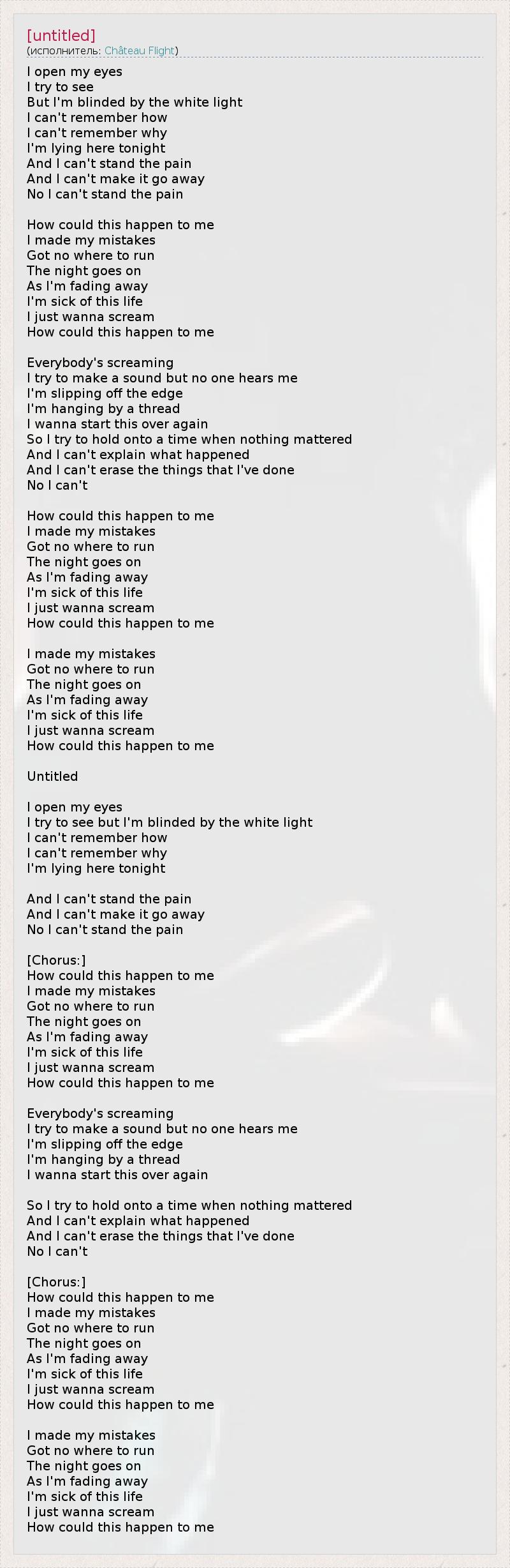 Глаза свои я открываю, Но чувствую, что видеть прекращаю. Во всем виновен этот свет И от него покоя нет. Сейчас я вспомнить не могу, Как ночью оказался я в аду. И эту боль уж не могу унять, Да и сейчас я не могу бежать. И эту боль я не смогу унять. Как со мной это случилось? Столько ошибок вдруг свершилось. Не куда теперь бежать, Ночь не станет помогать. Все я силы потерял, Так от жизни я устал. Я способен лишь кричать, Что случилось, хочу знать. Я слышу гул от голосов, Я сквозь него не слышу своих слов. На волоске, на грани, на пределе. Я так хочу начать сначала, В самом деле. О, как вернуть то время безмятежного покоя? Я не могу ведь описать, что же стряслось такое. И как стереть из памяти моей События давно минувших дней? Как со мной это случилось? Столько ошибок вдруг свершилось. Не куда теперь бежать, Ночь не станет помогать. Все я силы потерял, Так от жизни я устал. Я способен лишь кричать, Что случилось, хочу знать. Столько ошибок вдруг свершилось. Не куда теперь бежать, Ночь не станет помогать. Все я силы потерял, Так от жизни я устал. Я способен лишь кричать, Что случилось, хочу знать. Без названия (перевод лорд_Генри из Москвы) Я открываю глаза, Я пытаюсь посмотреть, но я ослеплен белым светом... Я не могу вспомнить, как, Я не могу вспомнить, почему Я лежу здесь сейчас... И я не могу вынести эту боль, Не могу прогнать ее, Нет, я не могу вынести эту боль... [Припев:] Как это могло случиться со мной? Я совершил свои ошибки, Бежать некуда. Ночь не прекращается,, И я постепенно исчезаю.... Я устал от этой жизни, Мне просто хочется кричать... Как это могло случиться со мной? Все кричат, Я пытаюсь произнести хоть звук, но меня никто не слышит.... Я скольжу по краю, Я держусь на волоске, Я хочу начать все с начала... И я пытаюсь держаться за времена, когда ничто не имело значения. Я не могу объяснить, что случилось, Не могу отменить того, что совершил, Нет, я не могу.... [Припев:] Как это могло случиться со мной? Я совершил свои ошибки, Бежать некуда. Ночь не прекращается,, И я постепенно исчезаю.... Я устал от этой жизни, Мне просто хочется кричать... Как это могло случиться со мной? Я совершил свои ошибки, Бежать некуда. Ночь не прекращается,, И я постепенно исчезаю.... Я устал от этой жизни, Мне просто хочется кричать... Как это могло случиться со мной?