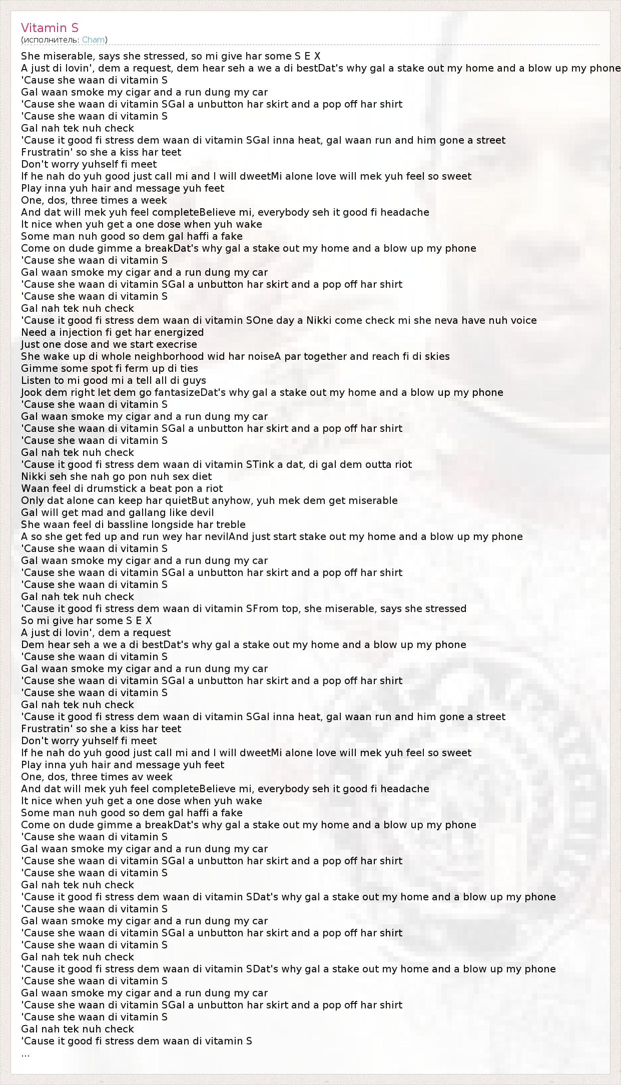 She miserable, says she stressed, so mi give har some S E X A just di lovin', dem a request, dem hear seh a we a di bestDat's why gal a stake out my home and a blow up my phone 'Cause she waan di vitamin S Gal waan smoke my cigar and a run dung my car 'Cause she waan di vitamin SGal a unbutton har skirt and a pop off har shirt 'Cause she waan di vitamin S Gal nah tek nuh check 'Cause it good fi stress dem waan di vitamin SGal inna heat, gal waan run and him gone a street Frustratin' so she a kiss har teet Don't worry yuhself fi meet If he nah do yuh good just call mi and I will dweetMi alone love will mek yuh feel so sweet Play inna yuh hair and message yuh feet One, dos, three times a week And dat will mek yuh feel completeBelieve mi, everybody seh it good fi headache It nice when yuh get a one dose when yuh wake Some man nuh good so dem gal haffi a fake Come on dude gimme a breakDat's why gal a stake out my home and a blow up my phone 'Cause she waan di vitamin S Gal waan smoke my cigar and a run dung my car 'Cause she waan di vitamin SGal a unbutton har skirt and a pop off har shirt 'Cause she waan di vitamin S Gal nah tek nuh check 'Cause it good fi stress dem waan di vitamin SOne day a Nikki come check mi she neva have nuh voice Need a injection fi get har energized Just one dose and we start execrise She wake up di whole neighborhood wid har noiseA par together and reach fi di skies Gimme some spot fi ferm up di ties Listen to mi good mi a tell all di guys Jook dem right let dem go fantasizeDat's why gal a stake out my home and a blow up my phone 'Cause she waan di vitamin S Gal waan smoke my cigar and a run dung my car 'Cause she waan di vitamin SGal a unbutton har skirt and a pop off har shirt 'Cause she waan di vitamin S Gal nah tek nuh check 'Cause it good fi stress dem waan di vitamin STink a dat, di gal dem outta riot Nikki seh she nah go pon nuh sex diet Waan feel di drumstick a beat pon a riot Only dat alone can keep har quietBut anyhow, yuh mek dem get miserable Gal will get mad and gallang like devil She waan feel di bassline longside har treble A so she get fed up and run wey har nevilAnd just start stake out my home and a blow up my phone 'Cause she waan di vitamin S Gal waan smoke my cigar and a run dung my car 'Cause she waan di vitamin SGal a unbutton har skirt and a pop off har shirt 'Cause she waan di vitamin S Gal nah tek nuh check 'Cause it good fi stress dem waan di vitamin SFrom top, she miserable, says she stressed So mi give har some S E X A just di lovin', dem a request Dem hear seh a we a di bestDat's why gal a stake out my home and a blow up my phone 'Cause she waan di vitamin S Gal waan smoke my cigar and a run dung my car 'Cause she waan di vitamin SGal a unbutton har skirt and a pop off har shirt 'Cause she waan di vitamin S Gal nah tek nuh check 'Cause it good fi stress dem waan di vitamin SGal inna heat, gal waan run and him gone a street Frustratin' so she a kiss har teet Don't worry yuhself fi meet If he nah do yuh good just call mi and I will dweetMi alone love will mek yuh feel so sweet Play inna yuh hair and message yuh feet One, dos, three times av week And dat will mek yuh feel completeBelieve mi, everybody seh it good fi headache It nice when yuh get a one dose when yuh wake Some man nuh good so dem gal haffi a fake Come on dude gimme a breakDat's why gal a stake out my home and a blow up my phone 'Cause she waan di vitamin S Gal waan smoke my cigar and a run dung my car 'Cause she waan di vitamin SGal a unbutton har skirt and a pop off har shirt 'Cause she waan di vitamin S Gal nah tek nuh check 'Cause it good fi stress dem waan di vitamin SDat's why gal a stake out my home and a blow up my phone 'Cause she waan di vitamin S Gal waan smoke my cigar and a run dung my car 'Cause she waan di vitamin SGal a unbutton har skirt and a pop off har shirt 'Cause she waan di vitamin S Gal nah tek nuh check 'Cause it good fi stress dem waan di vitamin SDat's why gal a stake out my home and a blow up my phone 'Cause she waan di vitamin S Gal waan smoke my cigar and a run dung my car 'Cause she waan di vitamin SGal a unbutton har skirt and a pop off har shirt 'Cause she waan di vitamin S Gal nah tek nuh check 'Cause it good fi stress dem waan di vitamin S ...