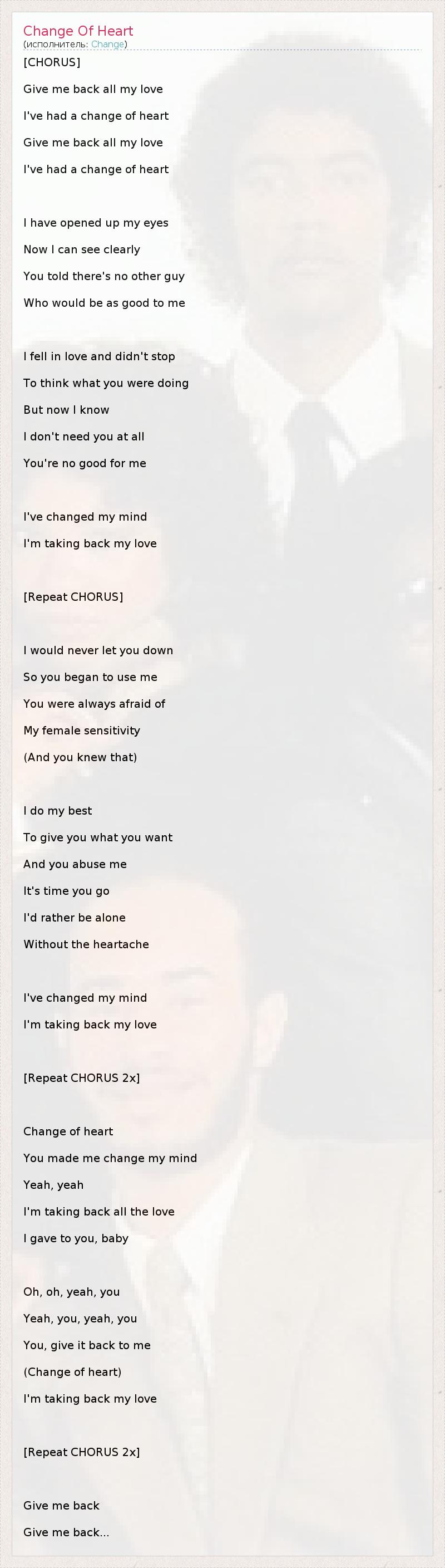 [CHORUS] Give me back all my love I've had a change of heart Give me back all my love I've had a change of heart I have opened up my eyes Now I can see clearly You told there's no other guy Who would be as good to me I fell in love and didn't stop To think what you were doing But now I know I don't need you at all You're no good for me I've changed my mind I'm taking back my love [Repeat CHORUS] I would never let you down So you began to use me You were always afraid of My female sensitivity (And you knew that) I do my best To give you what you want And you abuse me It's time you go I'd rather be alone Without the heartache I've changed my mind I'm taking back my love [Repeat CHORUS 2x] Change of heart You made me change my mind Yeah, yeah I'm taking back all the love I gave to you, baby Oh, oh, yeah, you Yeah, you, yeah, you You, give it back to me (Change of heart) I'm taking back my love [Repeat CHORUS 2x] Give me back Give me back...