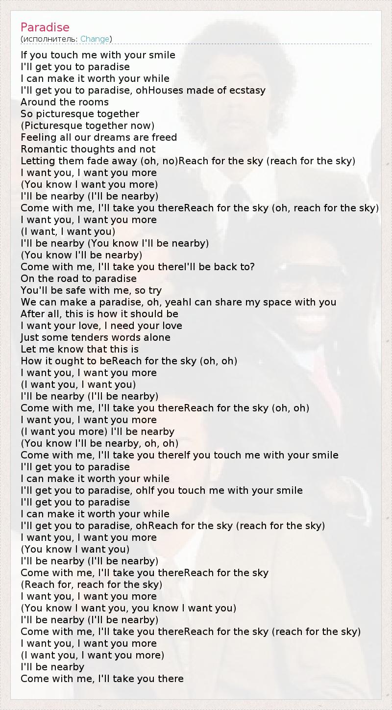 If you touch me with your smile I'll get you to paradise I can make it worth your while I'll get you to paradise, ohHouses made of ecstasy Around the rooms So picturesque together (Picturesque together now) Feeling all our dreams are freed Romantic thoughts and not Letting them fade away (oh, no)Reach for the sky (reach for the sky) I want you, I want you more (You know I want you more) I'll be nearby (I'll be nearby) Come with me, I'll take you thereReach for the sky (oh, reach for the sky) I want you, I want you more (I want, I want you) I'll be nearby (You know I'll be nearby) (You know I'll be nearby) Come with me, I'll take you thereI'll be back to? On the road to paradise You'll be safe with me, so try We can make a paradise, oh, yeahI can share my space with you After all, this is how it should be I want your love, I need your love Just some tenders words alone Let me know that this is How it ought to beReach for the sky (oh, oh) I want you, I want you more (I want you, I want you) I'll be nearby (I'll be nearby) Come with me, I'll take you thereReach for the sky (oh, oh) I want you, I want you more (I want you more) I'll be nearby (You know I'll be nearby, oh, oh) Come with me, I'll take you thereIf you touch me with your smile I'll get you to paradise I can make it worth your while I'll get you to paradise, ohIf you touch me with your smile I'll get you to paradise I can make it worth your while I'll get you to paradise, ohReach for the sky (reach for the sky) I want you, I want you more (You know I want you) I'll be nearby (I'll be nearby) Come with me, I'll take you thereReach for the sky (Reach for, reach for the sky) I want you, I want you more (You know I want you, you know I want you) I'll be nearby (I'll be nearby) Come with me, I'll take you thereReach for the sky (reach for the sky) I want you, I want you more (I want you, I want you more) I'll be nearby Come with me, I'll take you there