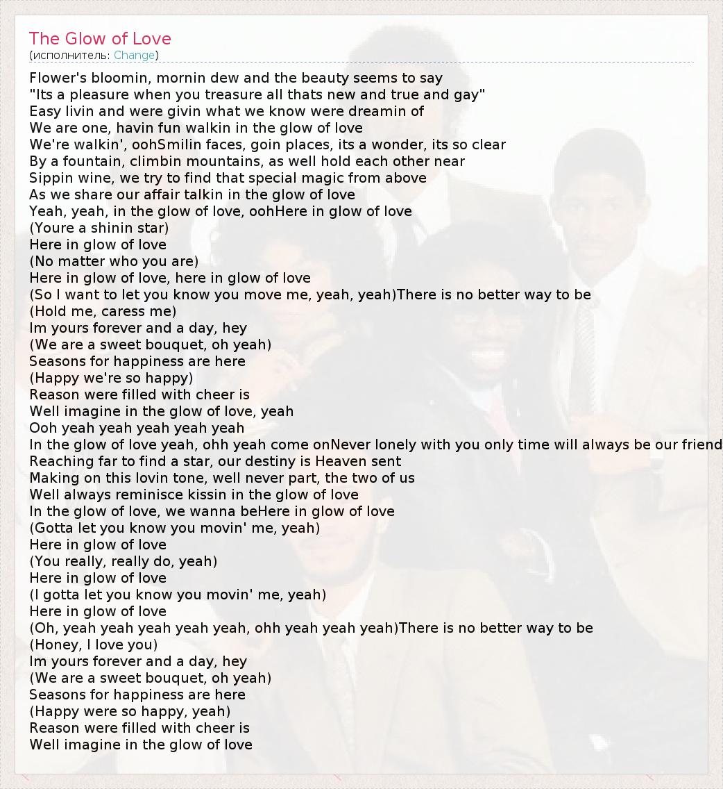 Flower's bloomin, mornin dew and the beauty seems to say "Its a pleasure when you treasure all thats new and true and gay" Easy livin and were givin what we know were dreamin of We are one, havin fun walkin in the glow of love We're walkin', oohSmilin faces, goin places, its a wonder, its so clear By a fountain, climbin mountains, as well hold each other near Sippin wine, we try to find that special magic from above As we share our affair talkin in the glow of love Yeah, yeah, in the glow of love, oohHere in glow of love (Youre a shinin star) Here in glow of love (No matter who you are) Here in glow of love, here in glow of love (So I want to let you know you move me, yeah, yeah)There is no better way to be (Hold me, caress me) Im yours forever and a day, hey (We are a sweet bouquet, oh yeah) Seasons for happiness are here (Happy we're so happy) Reason were filled with cheer is Well imagine in the glow of love, yeah Ooh yeah yeah yeah yeah yeah In the glow of love yeah, ohh yeah come onNever lonely with you only time will always be our friend Reaching far to find a star, our destiny is Heaven sent Making on this lovin tone, well never part, the two of us Well always reminisce kissin in the glow of love In the glow of love, we wanna beHere in glow of love (Gotta let you know you movin' me, yeah) Here in glow of love (You really, really do, yeah) Here in glow of love (I gotta let you know you movin' me, yeah) Here in glow of love (Oh, yeah yeah yeah yeah yeah, ohh yeah yeah yeah)There is no better way to be (Honey, I love you) Im yours forever and a day, hey (We are a sweet bouquet, oh yeah) Seasons for happiness are here (Happy were so happy, yeah) Reason were filled with cheer is Well imagine in the glow of love