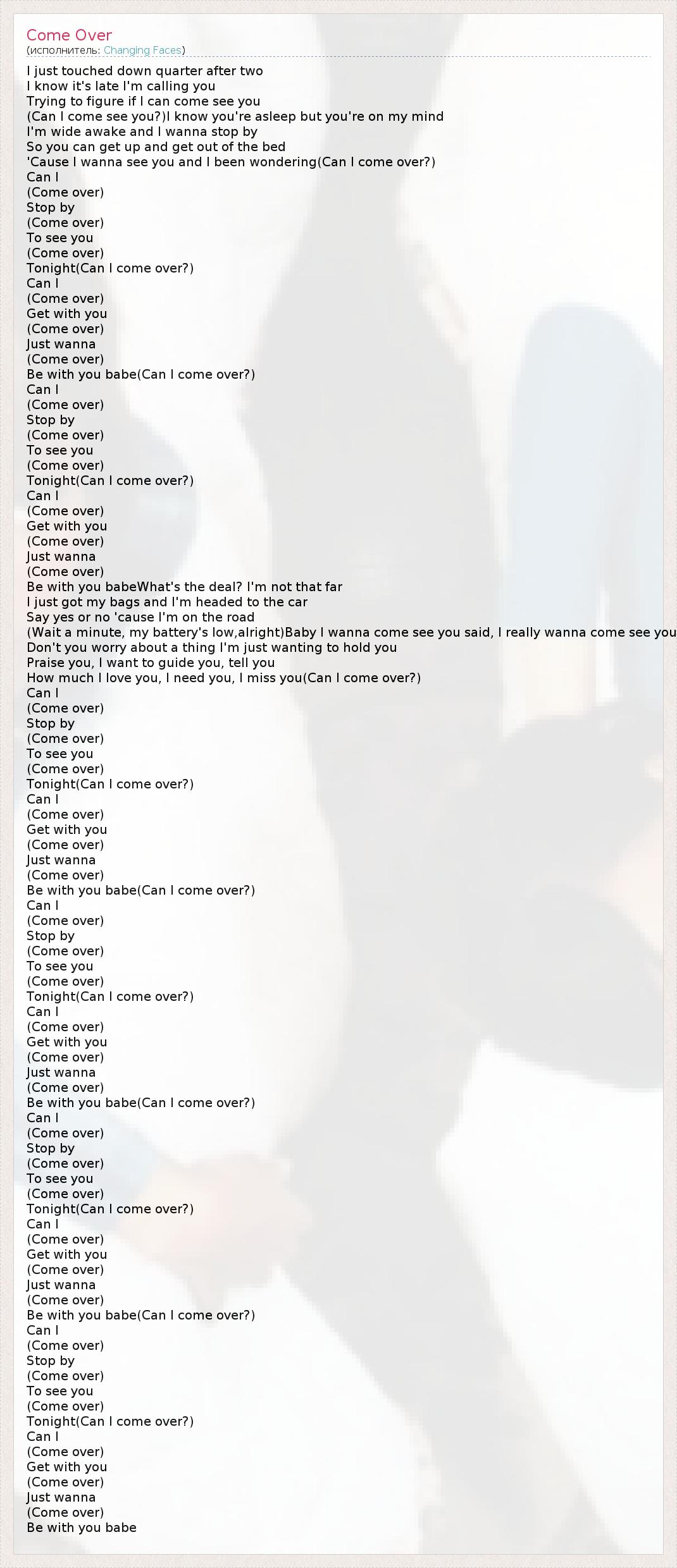 I just touched down quarter after two I know it's late I'm calling you Trying to figure if I can come see you (Can I come see you?)I know you're asleep but you're on my mind I'm wide awake and I wanna stop by So you can get up and get out of the bed 'Cause I wanna see you and I been wondering(Can I come over?) Can I (Come over) Stop by (Come over) To see you (Come over) Tonight(Can I come over?) Can I (Come over) Get with you (Come over) Just wanna (Come over) Be with you babe(Can I come over?) Can I (Come over) Stop by (Come over) To see you (Come over) Tonight(Can I come over?) Can I (Come over) Get with you (Come over) Just wanna (Come over) Be with you babeWhat's the deal? I'm not that far I just got my bags and I'm headed to the car Say yes or no 'cause I'm on the road (Wait a minute, my battery's low,alright)Baby I wanna come see you said, I really wanna come see you Don't you worry about a thing I'm just wanting to hold you Praise you, I want to guide you, tell you How much I love you, I need you, I miss you(Can I come over?) Can I (Come over) Stop by (Come over) To see you (Come over) Tonight(Can I come over?) Can I (Come over) Get with you (Come over) Just wanna (Come over) Be with you babe(Can I come over?) Can I (Come over) Stop by (Come over) To see you (Come over) Tonight(Can I come over?) Can I (Come over) Get with you (Come over) Just wanna (Come over) Be with you babe(Can I come over?) Can I (Come over) Stop by (Come over) To see you (Come over) Tonight(Can I come over?) Can I (Come over) Get with you (Come over) Just wanna (Come over) Be with you babe(Can I come over?) Can I (Come over) Stop by (Come over) To see you (Come over) Tonight(Can I come over?) Can I (Come over) Get with you (Come over) Just wanna (Come over) Be with you babe